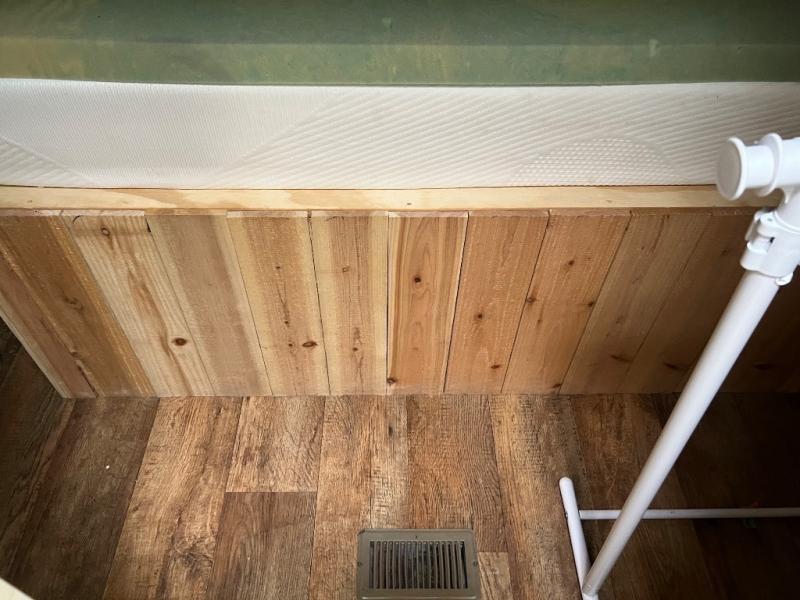 In the front bedroom you will find a queen bed, nightstand, laundry chute, and wardrobe. There is also an entrance door leading outside from the bedroom.