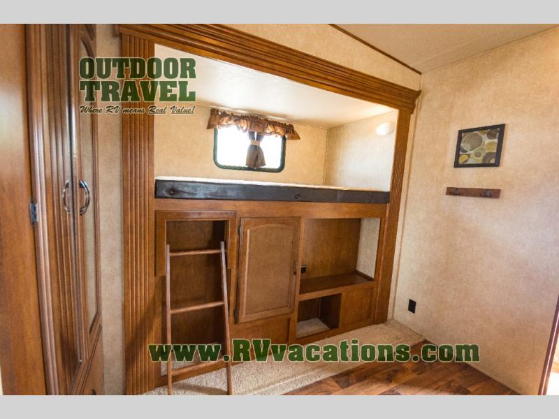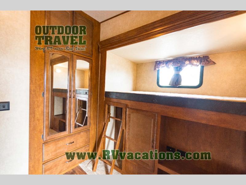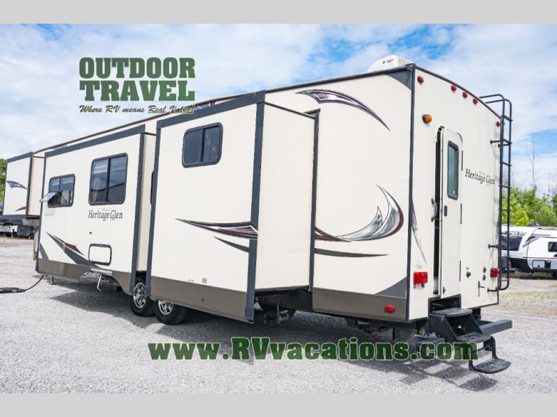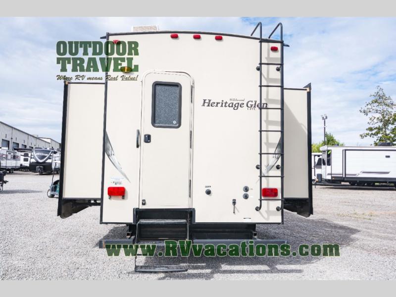The Wildwood Heritage Glen 356QB fifth wheel by Forest River offers quad slides and a rear bunk house.