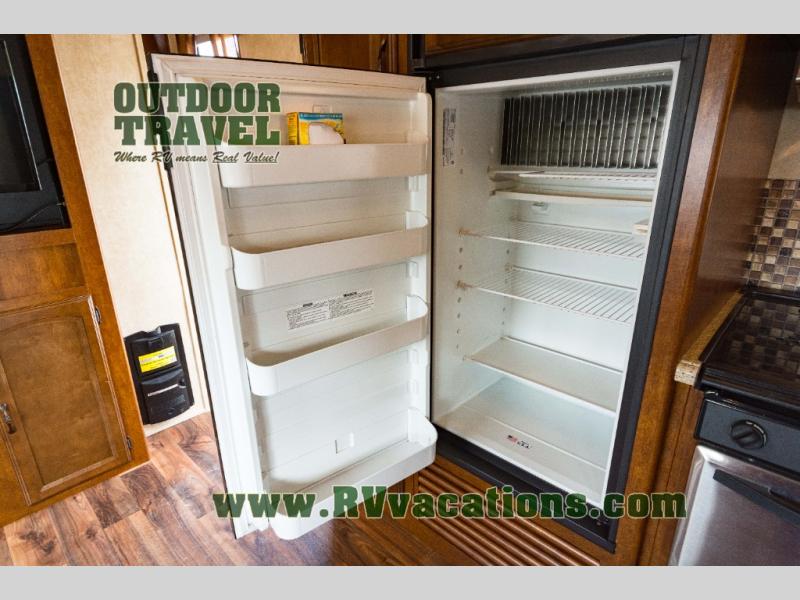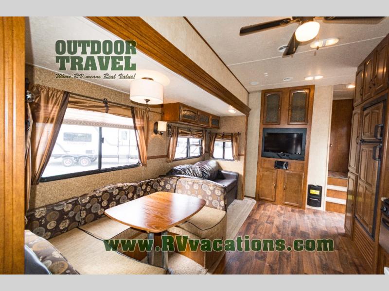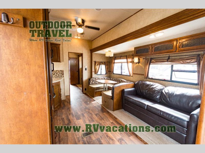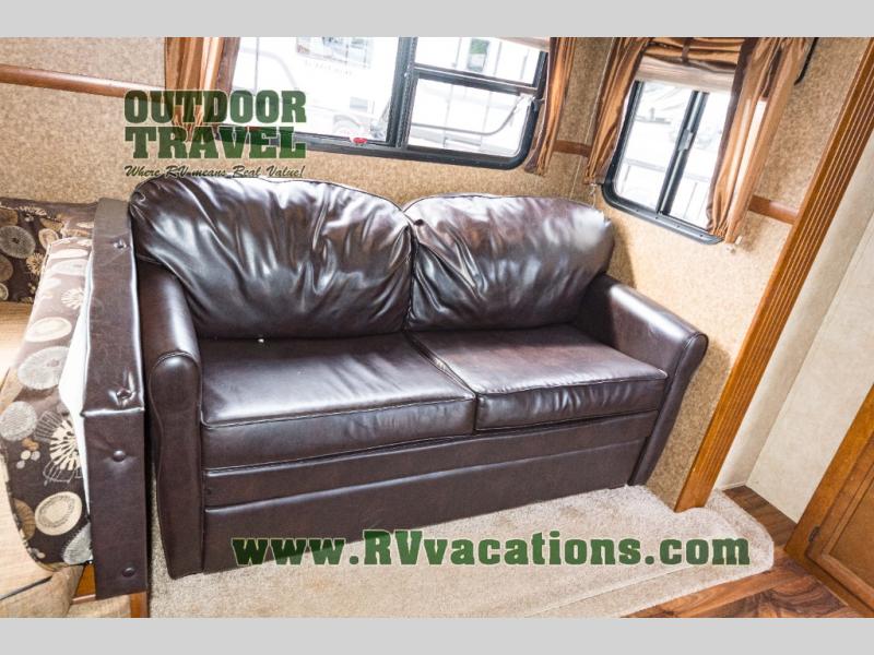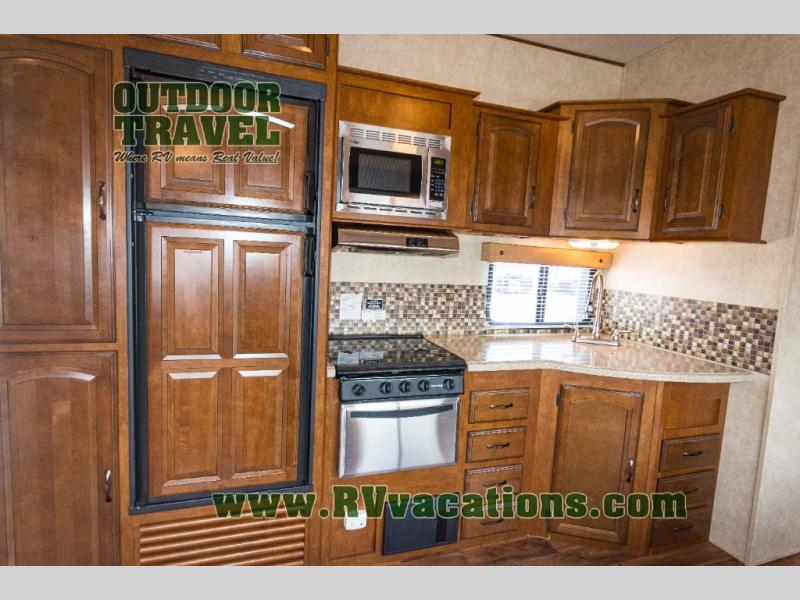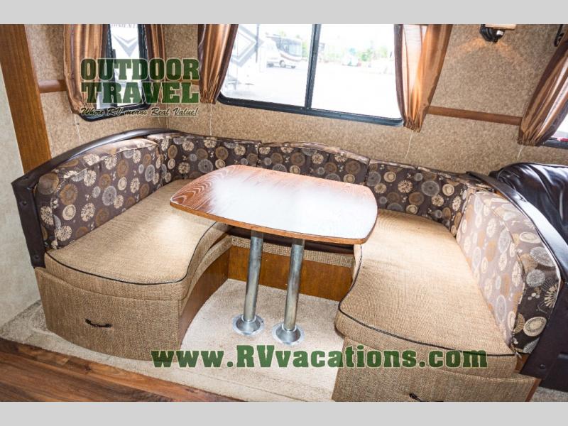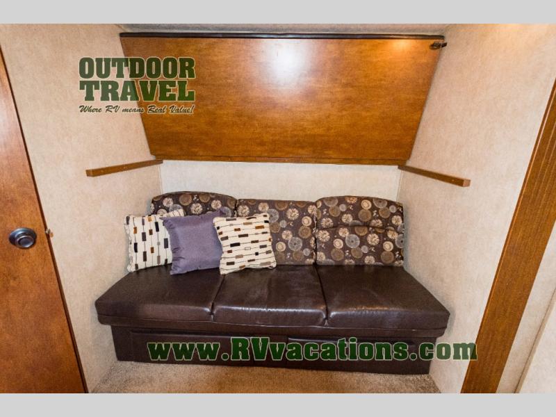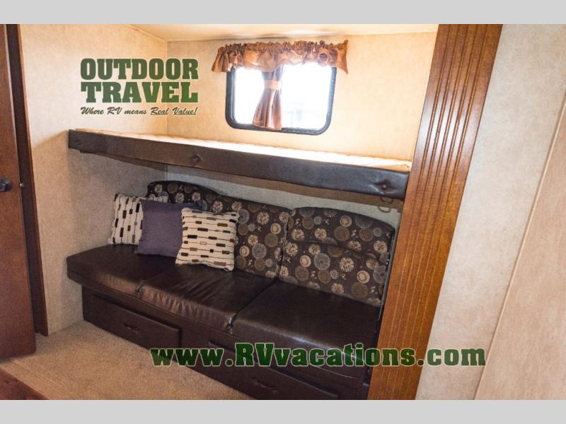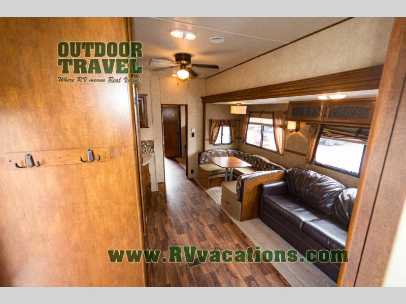 As you enter the 356QB, to the left is a pantry, refrigerator, microwave, three burner range, and double kitchen sink. The opposite side has a slide with a u-dinette and a tri-fold sofa.