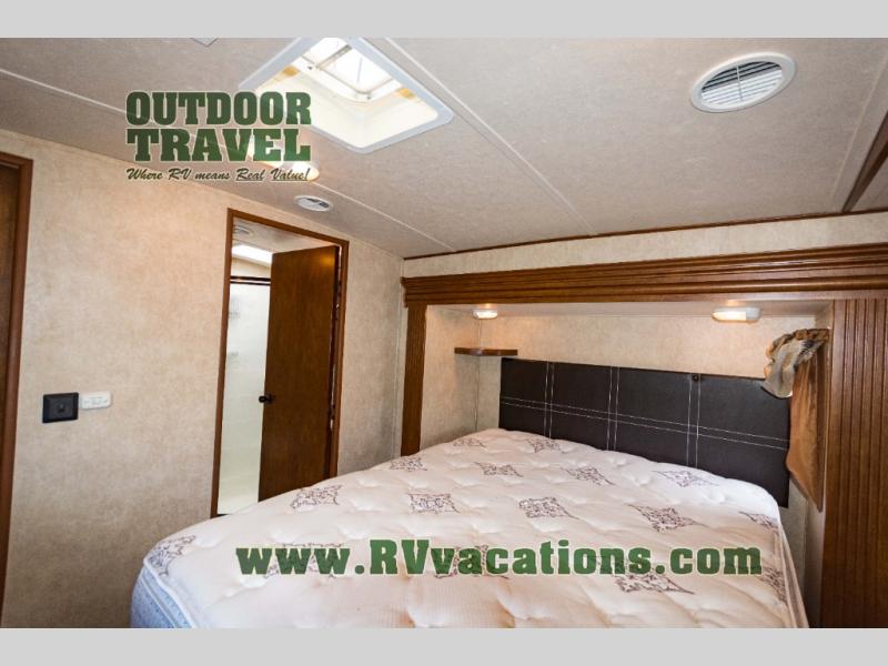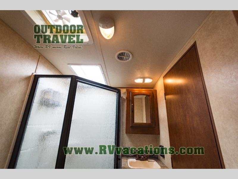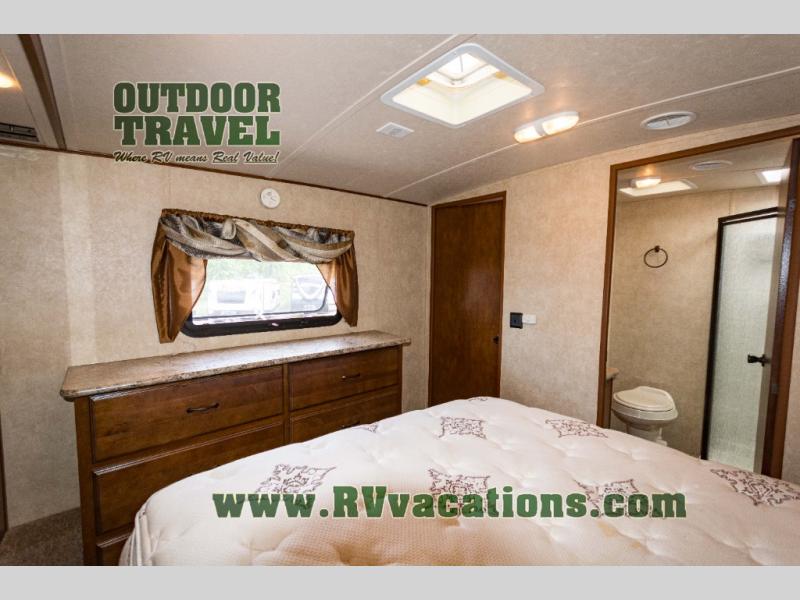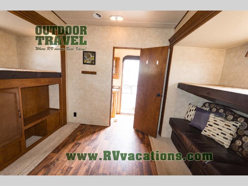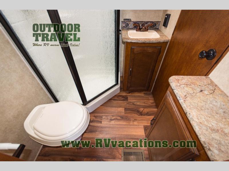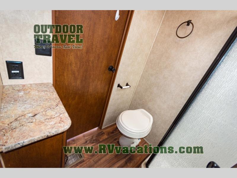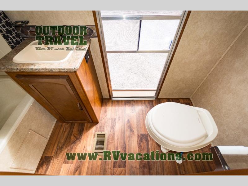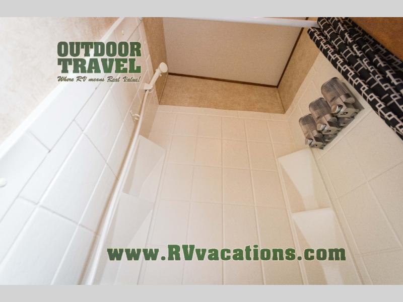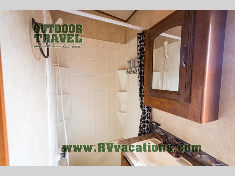 The bunk house offers two slides for added space. One slide has a set of bunk beds. The other slide has a wardrobe and entertainment center with a bunk above. One added bonus to the bunk house is the full bathroom just off of the bunk house. In the bathroom you will find a toilet, sink, medicine cabinet, and tub. There is also a private entrance outside from the bathroom.