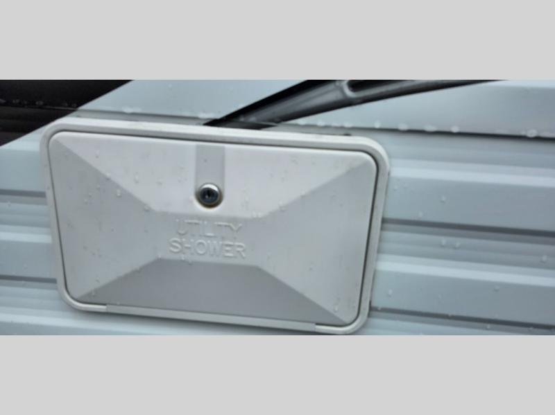 As you enter the travel trailer to the right is a sofa and end table. Along one wall you will find a double kitchen sink, three burner range, microwave, and refrigerator. The opposite side of the travel trailer has a dinette.