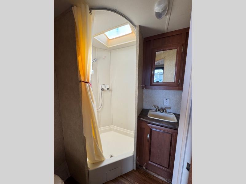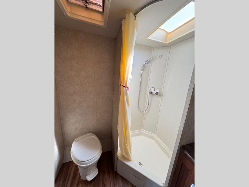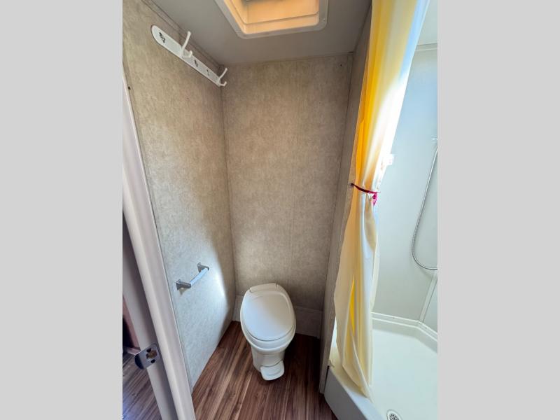 As you enter the travel trailer, to the left is a wardrobe. The bathroom has a toilet, corner shower, and sink.