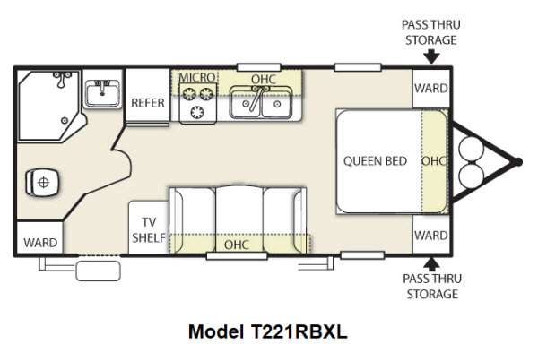 You will find overhead cabinets inside the trailer as well as an exterior pass thru storage.