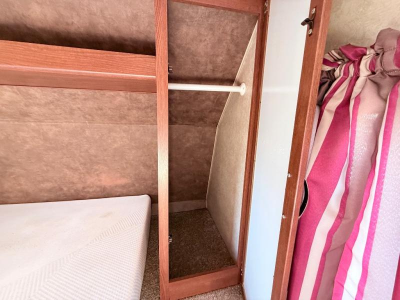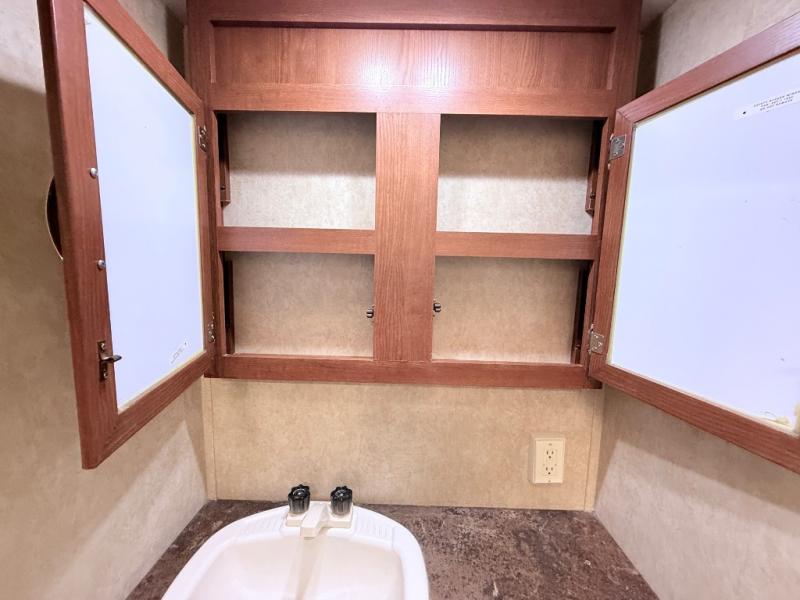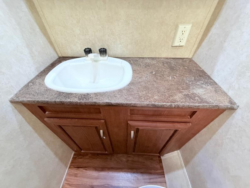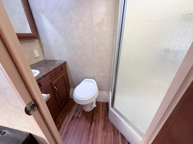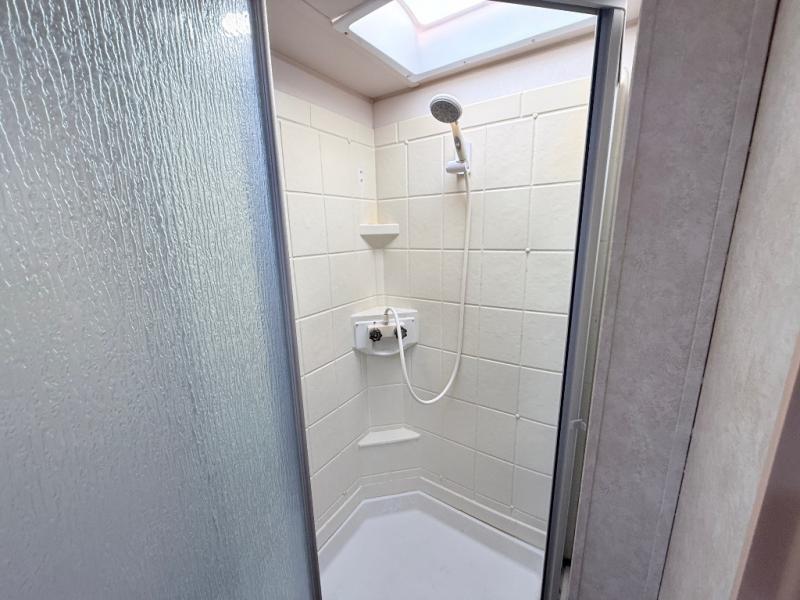The bathroom is the full width of the rear and offers a corner shower, toilet, vanity sink and medicine cabinet.