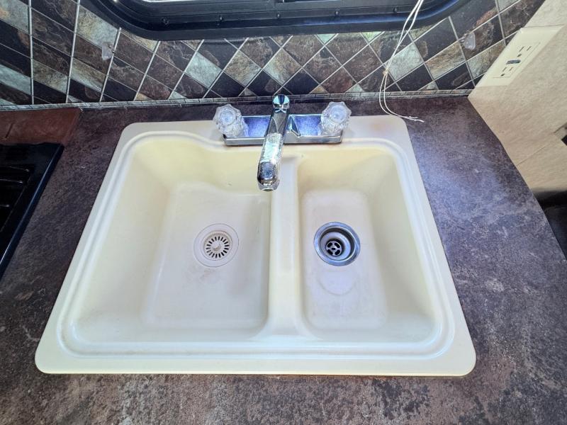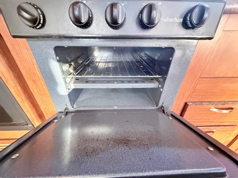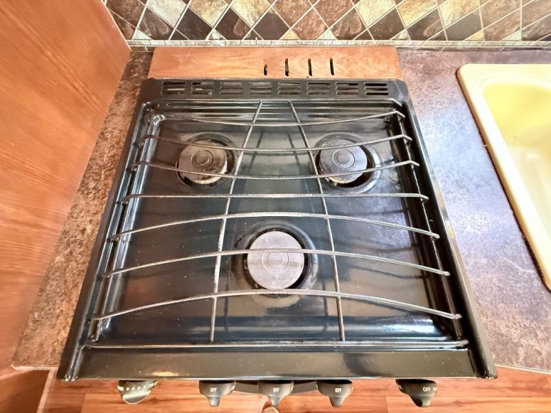 The living/dining/kitchen area provides a sofa, a booth dinette, a refrigerator, a three burner range, overhead microwave, double kitchen sink and lots of overhead cabinets throughout this travel trailer.