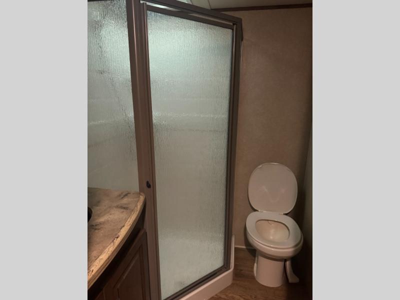 Up the steps at the front, a side aisle bath includes a toilet, corner shower, vanity sink and medicine cabinet.