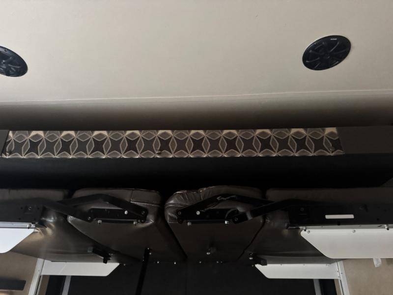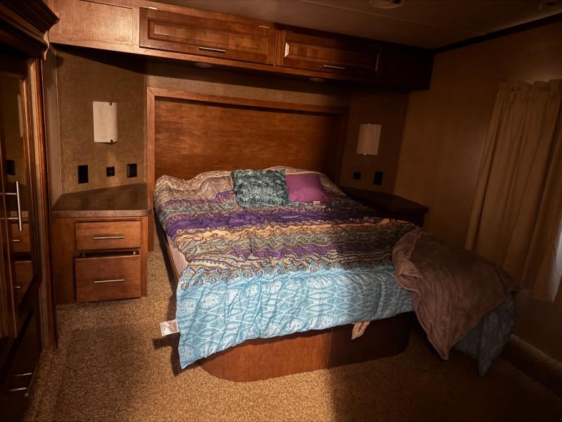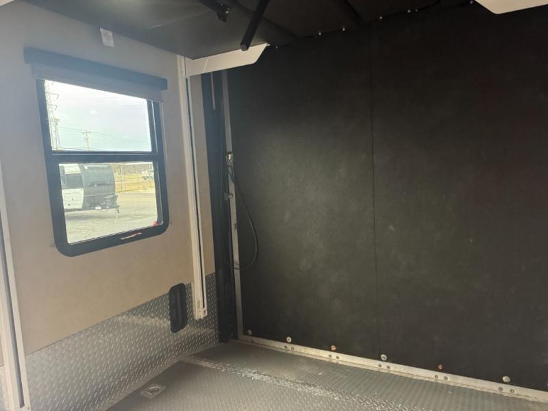 As you enter through the 8' rear spring assist ramp door, you will find plenty of cargo space for all of your toys along with overhead cabinets and washer/dryer prep along the front wall. There is also a side man door, and an electric bed and pass thru dinette at the rear of the garage.
