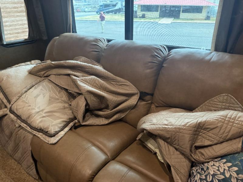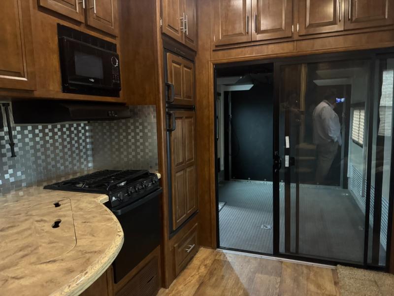 Inside the living area, a slide out on the road side opens up the floor space and includes theater seating. Across the toy hauler, the kitchen includes a refrigerator, three burner range, overhead microwave, overhead cabinets and an angled double kitchen sink.