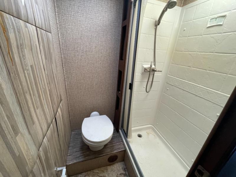 As you head toward the rear of the coach find a large vanity with sink on the left, plus a private toilet and shower with linen cabinet on the right. Beyond the bath area find a queen bed slide with overhead storage including nightstands on both sides of the bed. There is also a wardrobe and drawers on the opposite side of the bed for all of your clothing storage needs, and so much more!