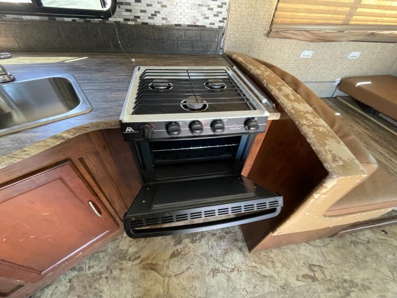 Opposite the door side is a slide out booth dinette and three burner range, plus a double sink. An entertainment center is located along the interior wall near the dinette slide for your enjoyment.
