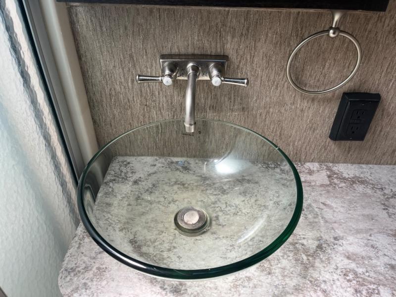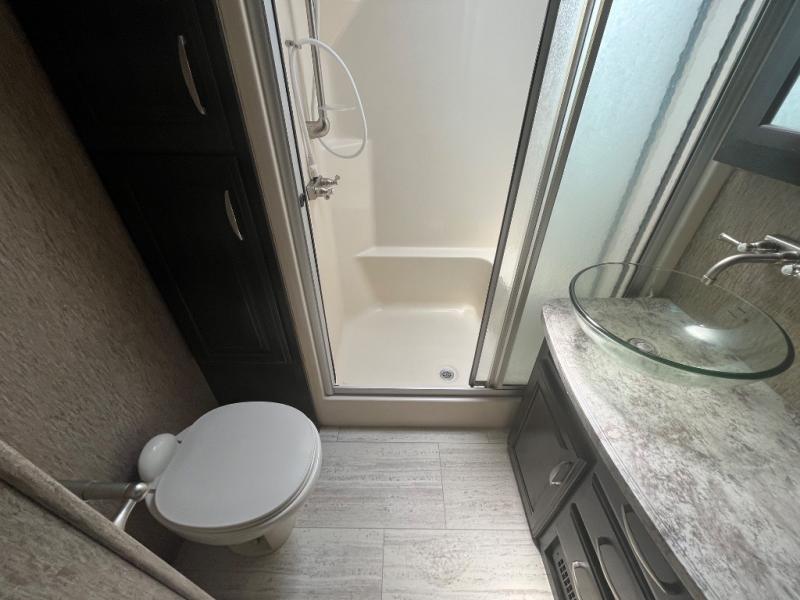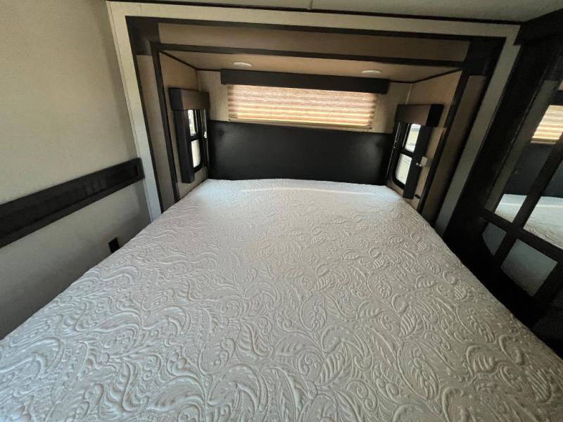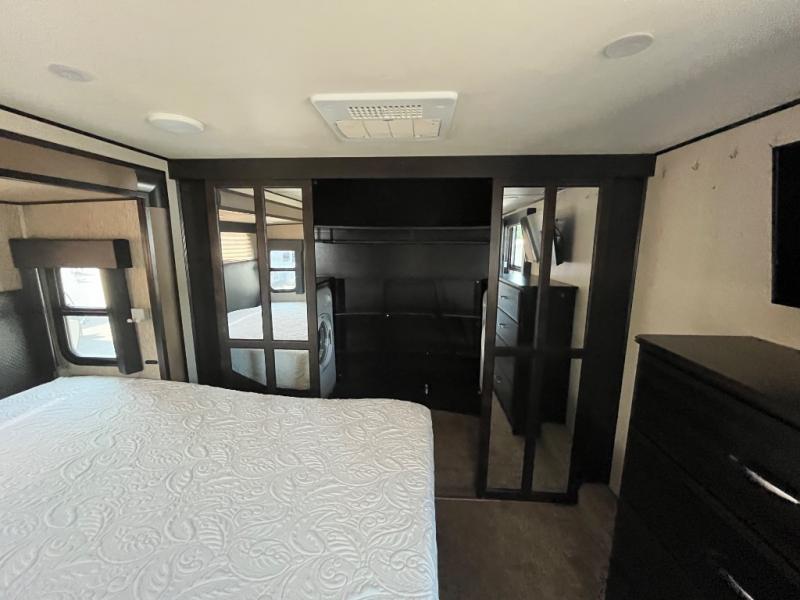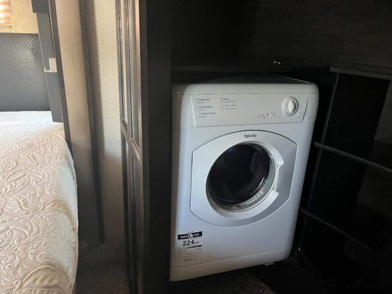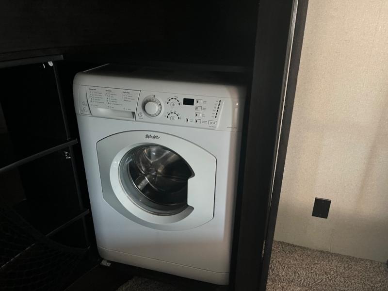 The front offers a private bedroom with slide out queen bed, or optional king if you choose. There is a pull out ottoman at the foot of the bed, plus a dresser for clothing along the opposite wall. You can also add an optional HDTV above the dresser if you would like. Find plenty of storage in the front walk-in closet with shirt storage and one side. The opposite side has been prepped for a washer and dryer, plus so much more!