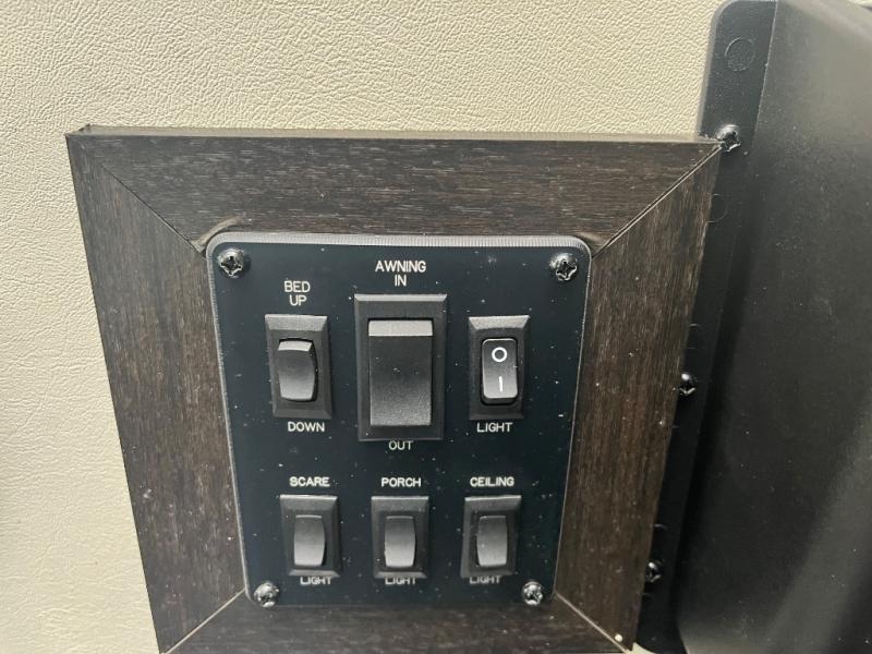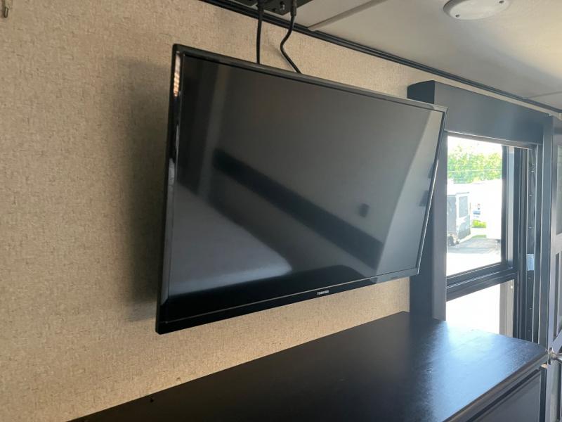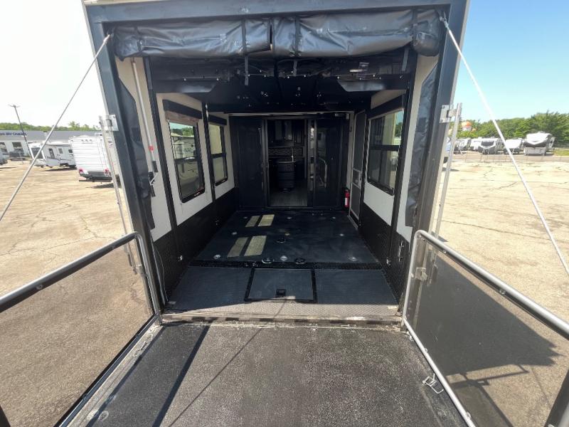 The rear 92" x 96" rear ramp door makes loading and unloading a cinch. Inside the garage space find an optional split bench seat/sofa bed lift with 60" x 92" bed lift for ample seating during the day and sleeping space at night for family and friends once you are parked and the toys are removed. You can also enjoy a 32" LED TV and overhead storage in this space, plus shelf on either side for storage.