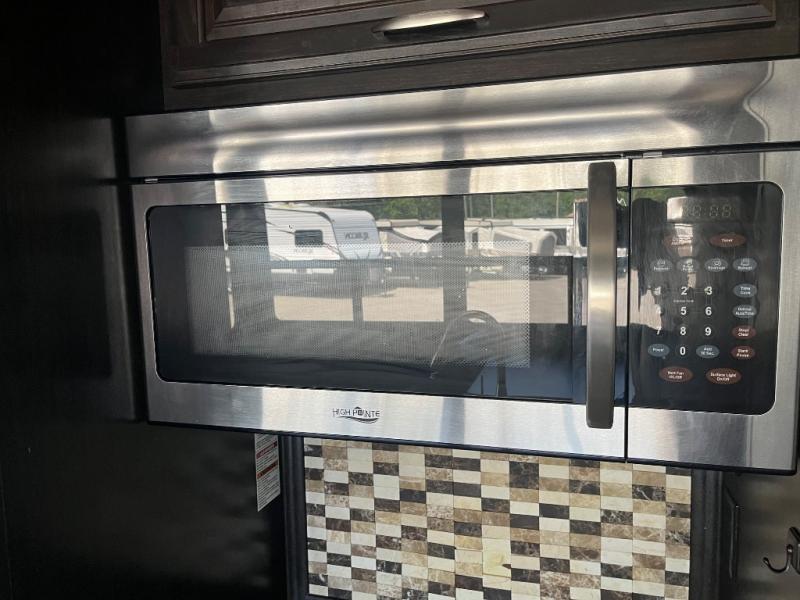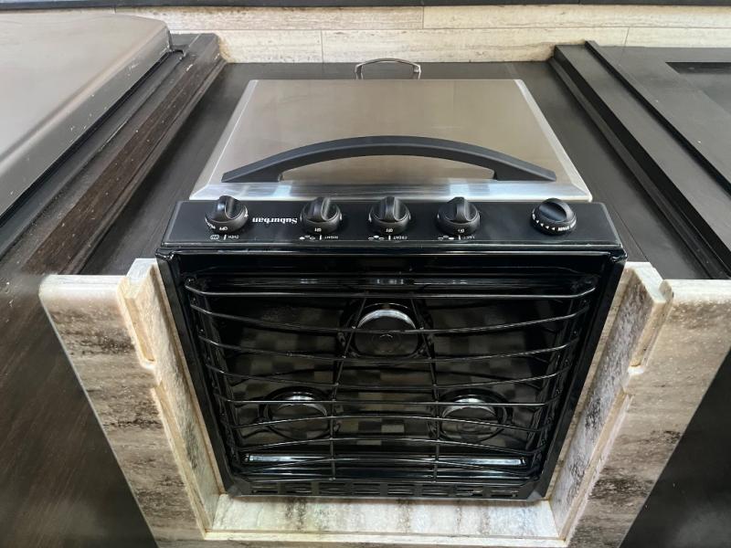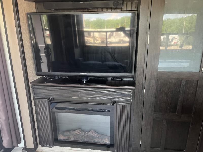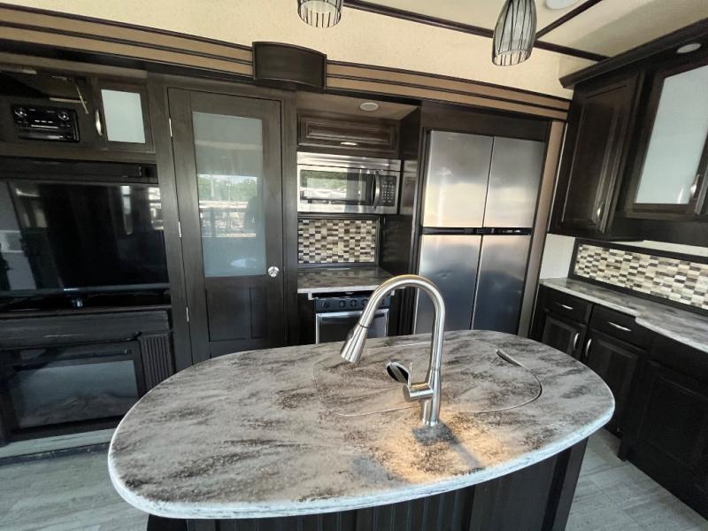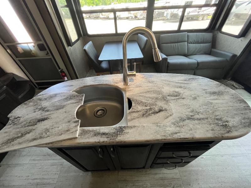 Opposite the door side enjoy a kitchen which features a slide out refrigerator, s three burner range, overhead storage, a pantry, and entertainment center with fireplace below the LED TV. There is also a center island for added counter space, plus a double kitchen sink as well.
