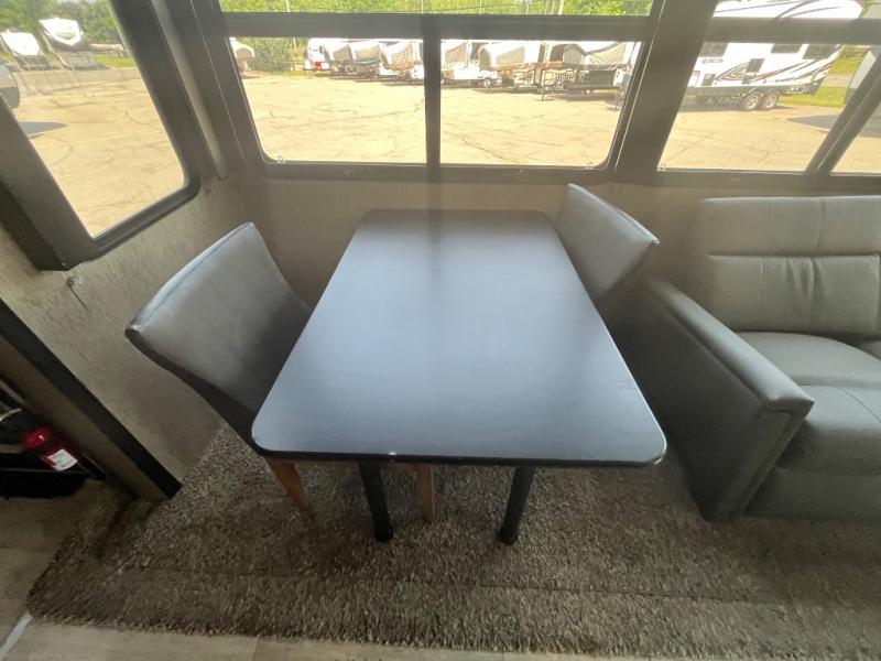 Head into the main living space from inside the cargo garage, or use the main side entry door. The cargo area also features a side man door for easy access once the rear ramp door is closed. Once inside the main living area notice the spaciousness that the dual slide outs create. There is theater seating and a dining table and chairs along the door side slide out. A hutch with overhead cabinets is found straight in from the side entry door.