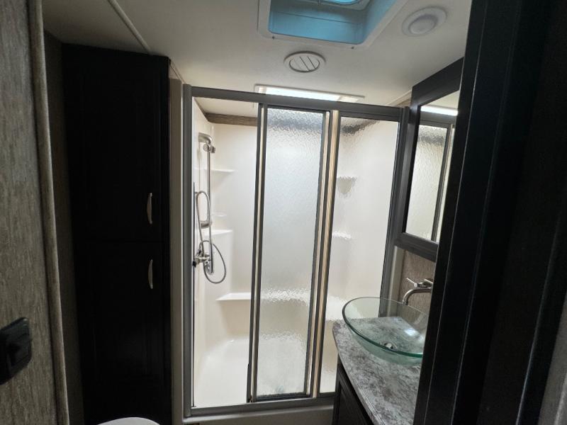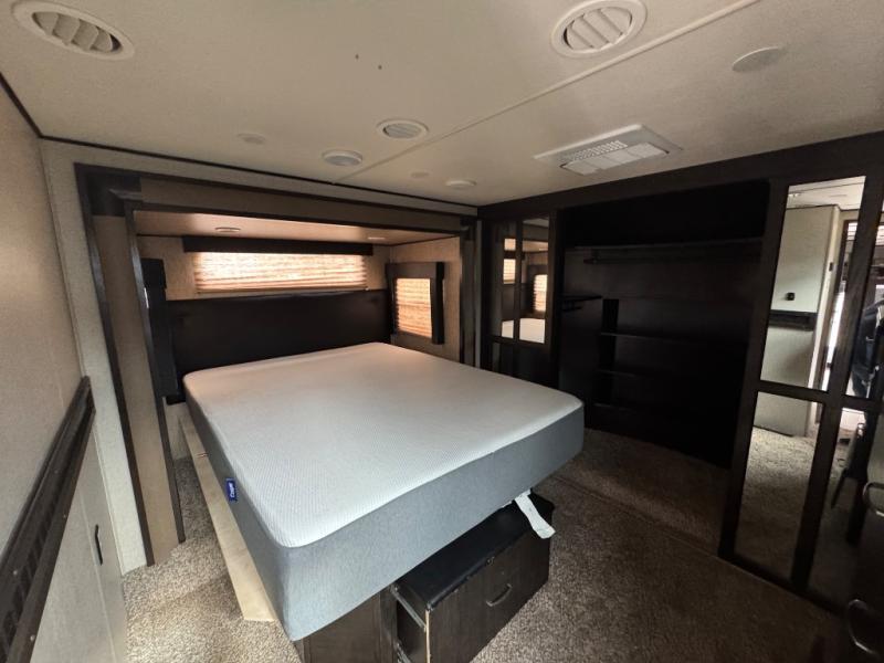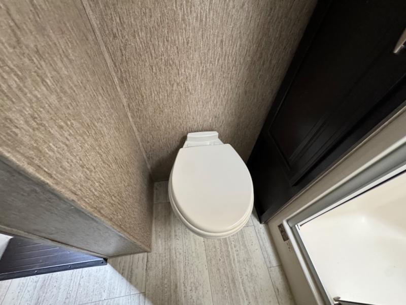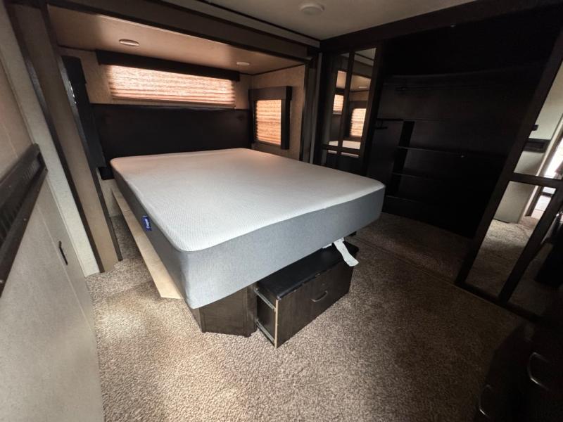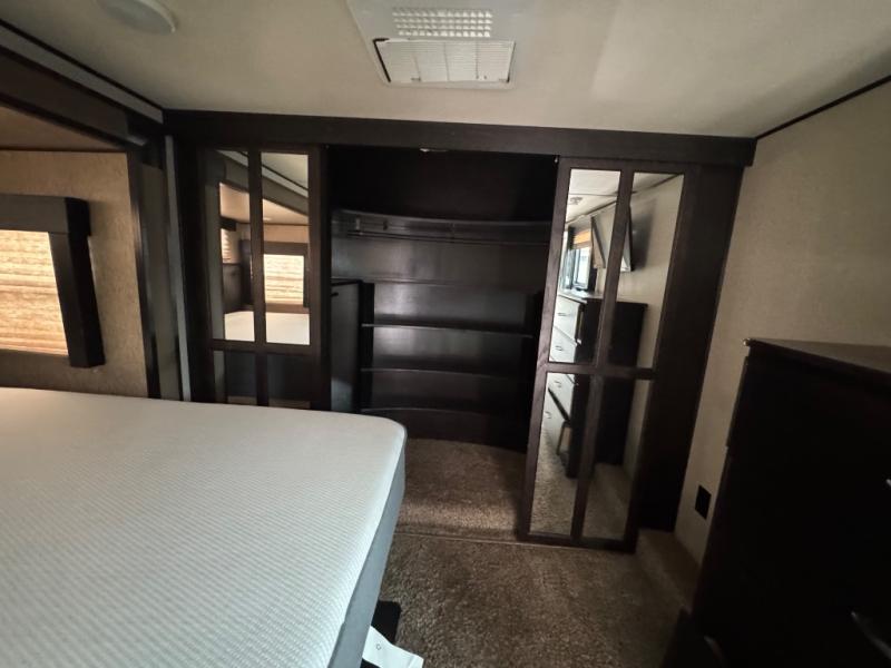 The front master suite features a slide out queen bed with optional king. There is a pull-out ottoman at the foot of the bed, a dresser with optional HD TV above, and a large closet with shirt storage on one side and washer dryer prep opposite, and so much more!