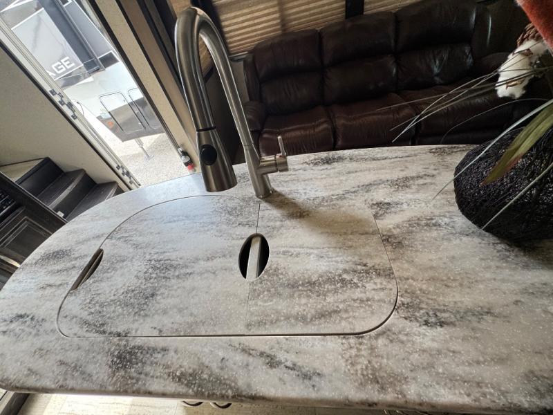 The combined kitchen and living space features dual slides with a large lounge seating slide with overhead cabinets the entire width of the slide, plus a stowable table for convenient dining. Across the room there is a pantry, a three burner range, 8 cu. ft. refrigerator (optional 18 cu. ft.), and second smaller pantry for cooking and food storage. A kitchen island with double sinks makes food prep and clean up a breeze also.
