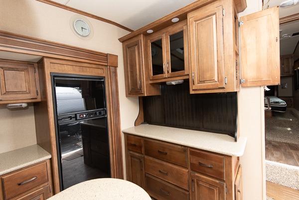 Tucked in the rear of the fifth wheel you will find a hide-a-bed sofa that is perfect for relaxing and also provides additional sleeping when needed (queen sized bed).