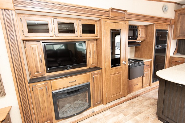 To your immediate left of the entrance you will see an optional dinette along with theater seating in a slide out. There is a center kitchen island which includes a double sink for easy food prep and cleanup. Directly opposite is a second larger slide featuring a refrigerator, a three burner range, and pantry for dry goods storage. This slide also features a entertainment center with 39" TV with overhead storage cabinets and fireplace. There is also a hutch with overhead storage straight in from the entrance to the right of the kitchen island.