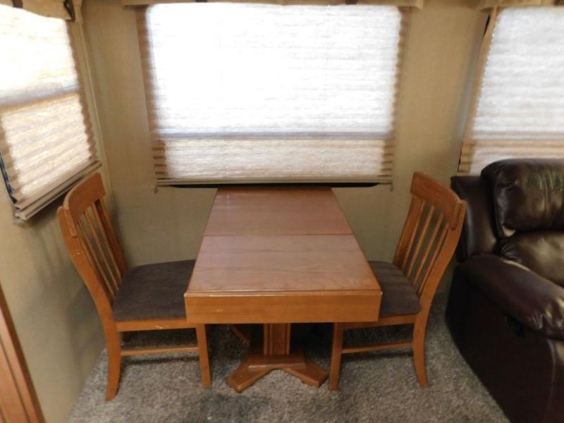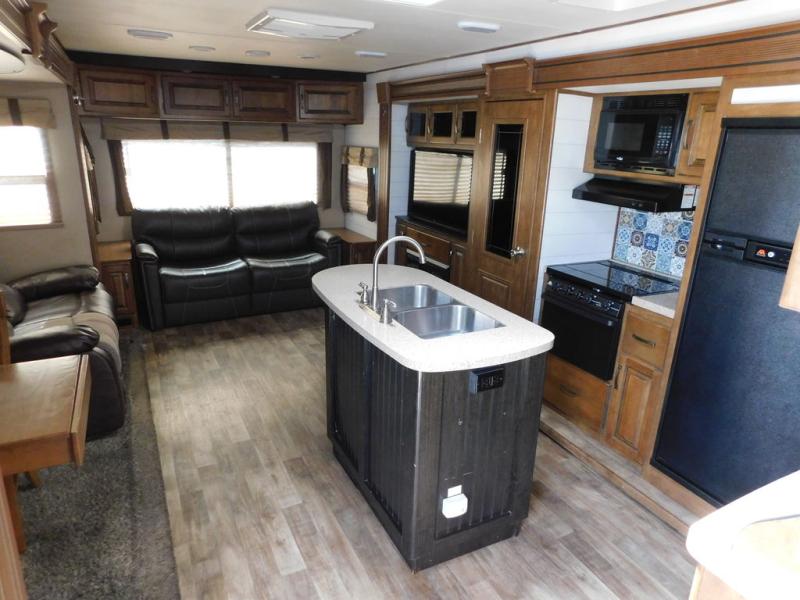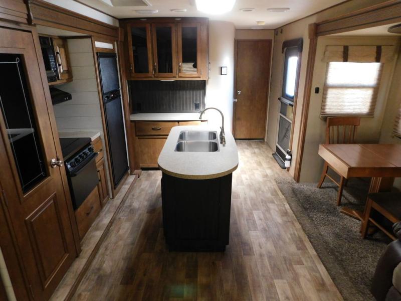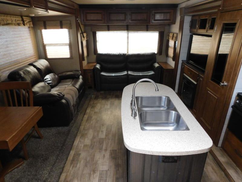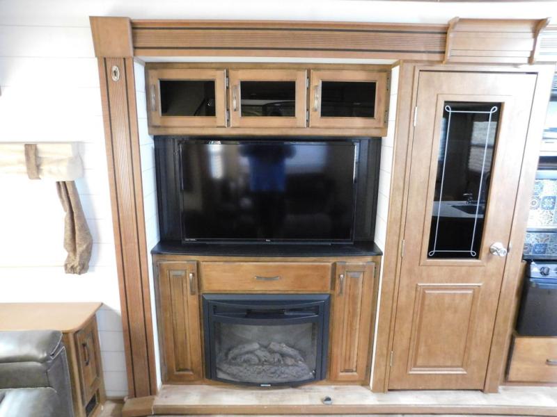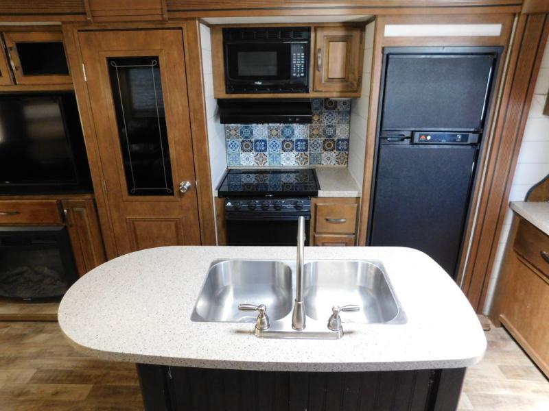The slide opposite the door side features a 39" TV entertainment center with fireplace, a large pantry, three burner range, and refrigerator. An off center island is where you will find a double sink, more counter space, and a bit more storage. There is also a hutch with overhead cabinets along the interior wall, plus so much more!