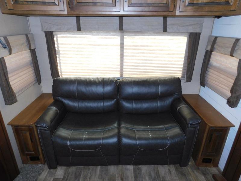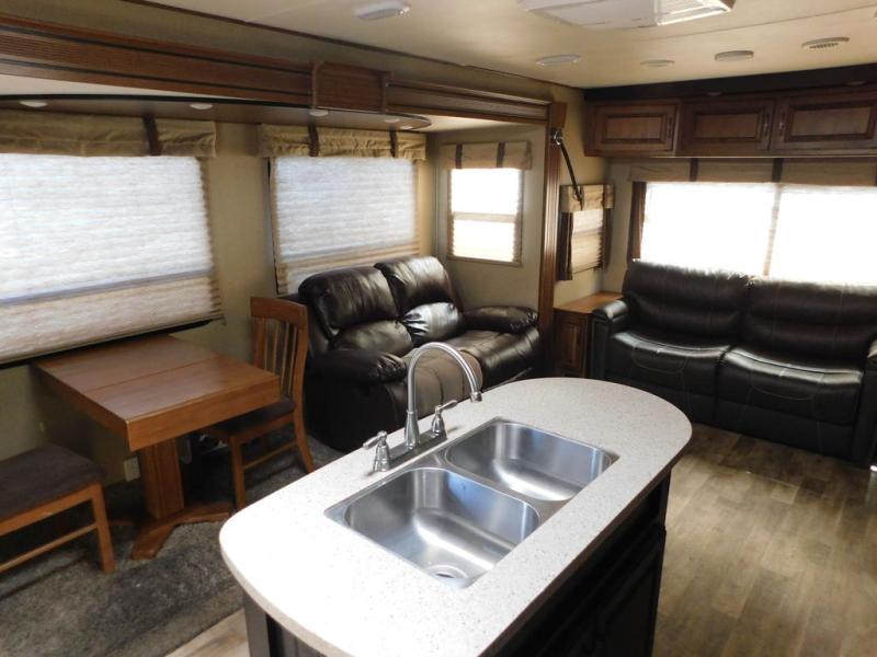 To the left as you enter Reflection 313RLTS you will see a spacious combined kitchen and living room with dual opposing slides. There is a booth dinette and theater seats slide out on the door side providing seating and dining conveniences with the option of choosing a free standing dinette.