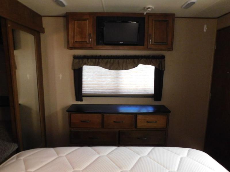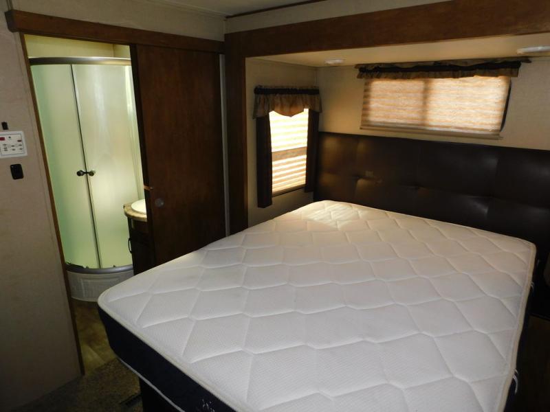 The master bedroom can also be accessed from a hall doorway. Inside find a queen bed slide, or choose the optional king. There is exterior storage at the head of the bed slide. Opposite along the curb side wall find a dresser with storage above, and a space prepped for TV if you wish to add. The front wall features a wardrobe with pass-through access and washer/dryer prep.