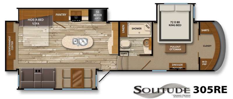 This Grand Design Solitude fifth wheel model 305RE features triple slides for added space, a rear entertainment center layout, and a king size bed!