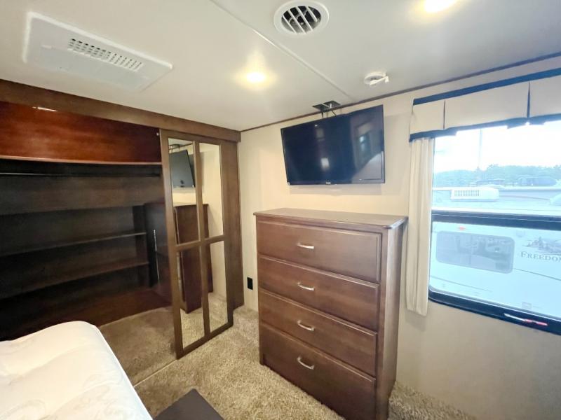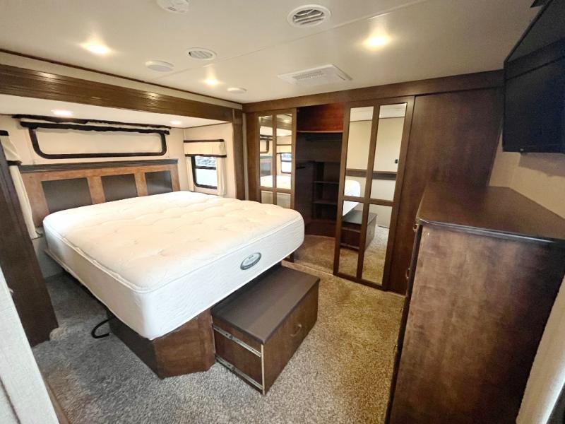 The private front bedroom features a king size bed slide-out, a pull-out ottoman at the foot of the bed, dresser along the opposite wall, and a full front wall closet with shirt storage and so much more. There is washer/dryer prep and an optional bedroom TV and so much more!