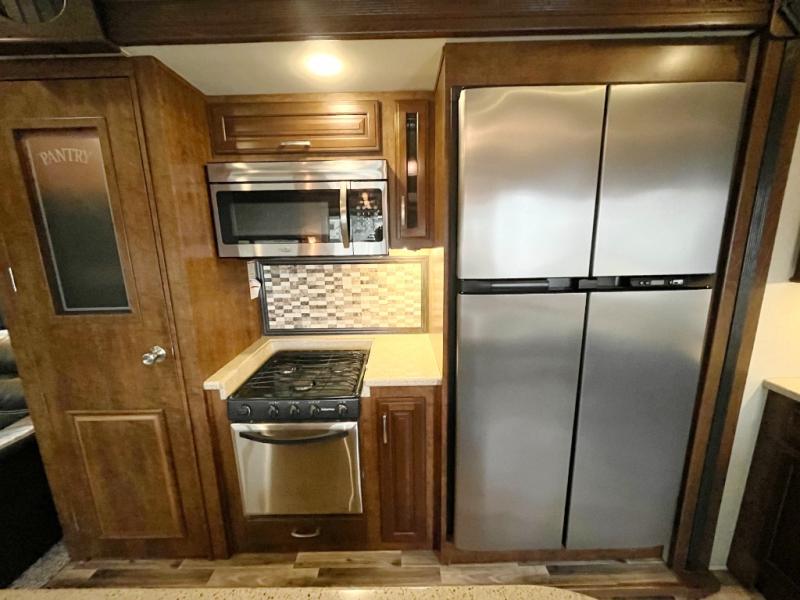 The slide opposite the doors side features a hide-a-bed sofa, large pantry for dry good storage, a three burner range, and refrigerator. You can add an optional 12 cu. ft. side-by-side refrigerator if you choose. There is also additional counter space along the interior living room wall with more storage cabinet above and below. The center island features a double kitchen sink and added counter space also.