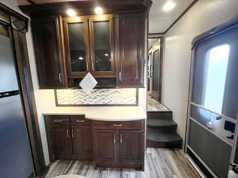 Step inside and notice how spacious the combined kitchen and living area is with dual opposing slides fully extended. There is a dinette table with four chairs and theater seating for two with cup holders and overhead storage in a slide-out to the left of the entry door.
