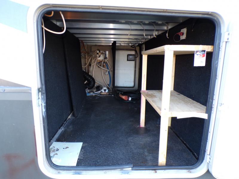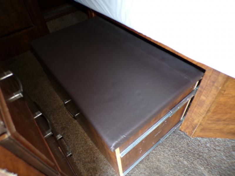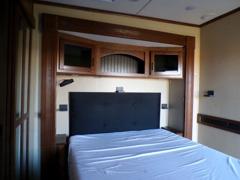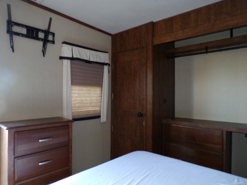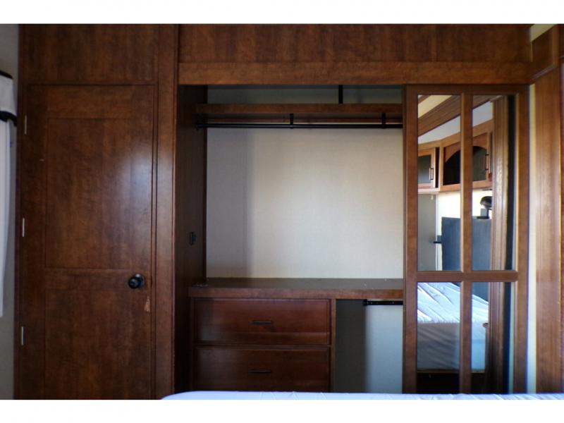 The rear private bedroom with its own entry door features a standard queen size bed slide-out, or you may choose an optional king. There is a pull-out ottoman at the foot of the bed, and an LED HDTV on the opposite wall. Along the rear wall of the bedroom you will find a double closet with drawers on one side, and a space prepped for a washer and dryer if you choose to add also.
