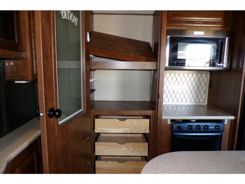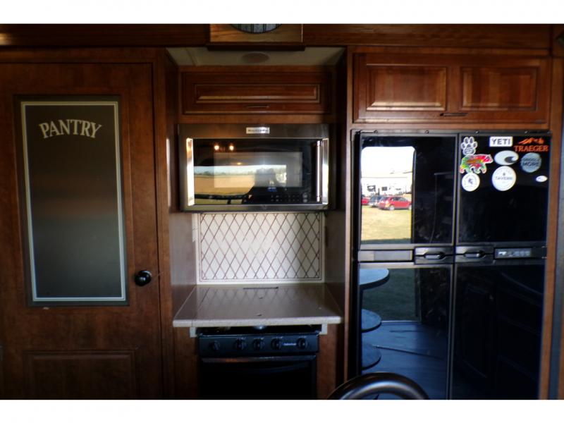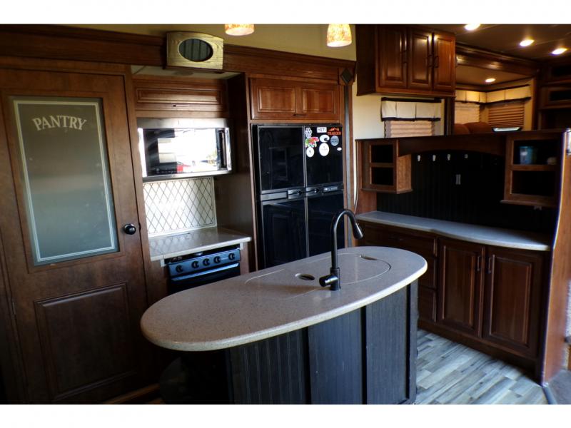 Step inside the entry door closest to the front. As you enter you are in a spacious kitchen featuring dual opposing slides. To your left is a slide-out dinette table and chairs. There is a center island with double sinks including counter space. You will find even more counter space on either side of the room along the interior walls with overhead cabinets and base cabinet storage also. The slide opposite the dinette features a large pantry, three burner range, refrigerator, and second smaller pantry.