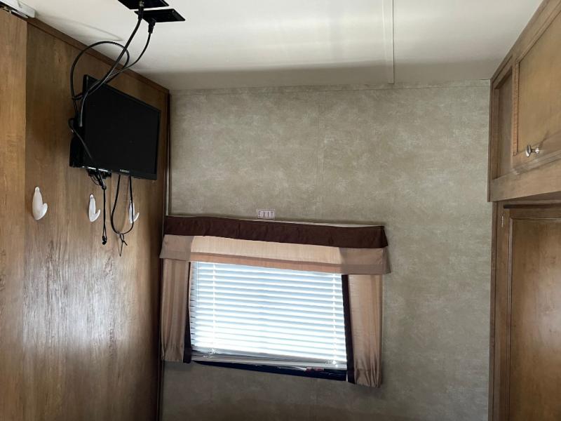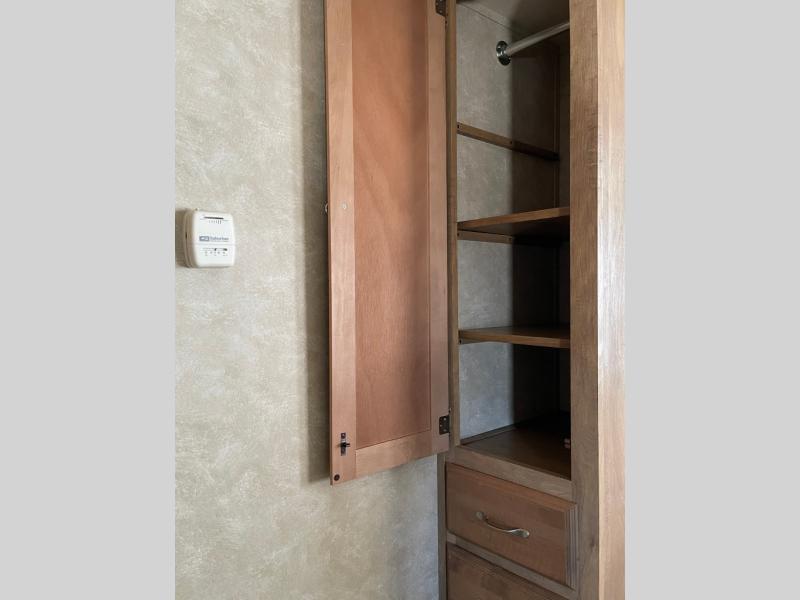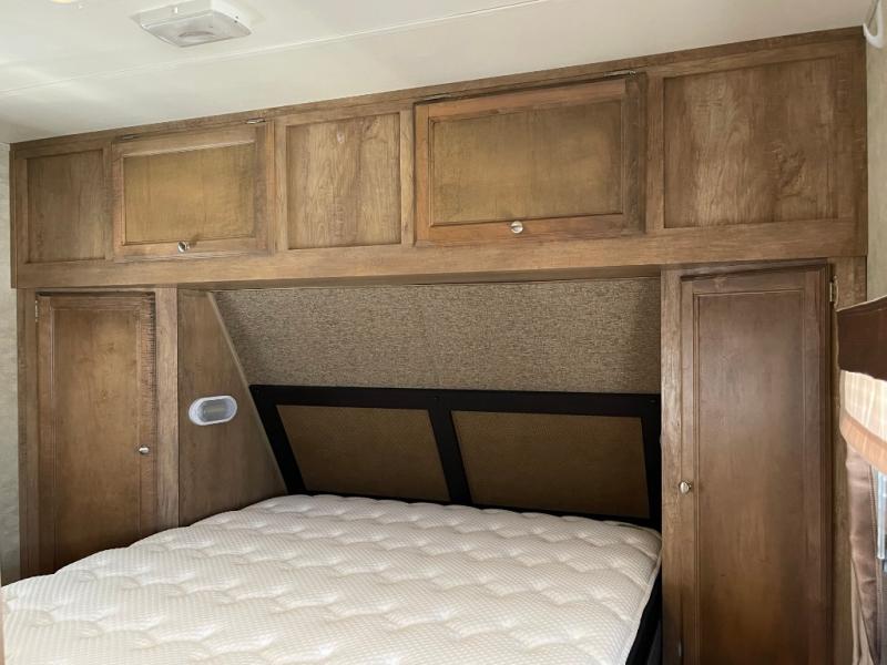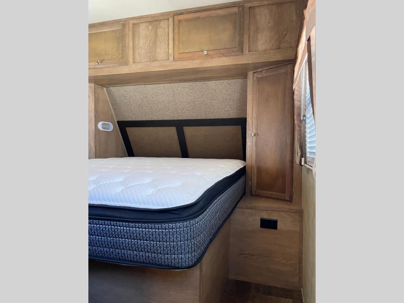 The front bedroom features a queen size bed with wardrobes on both sides of the bed. There is also an overhead cabinet too. There are curtains on either side of the entertainment center just off the foot of the bed that can be pulled to create more privacy.