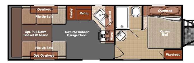 Enjoy this 24RTH Track n Trail toy hauler travel trailer from Gulf Stream Coach for all of your outdoor adventures. This unit features a large cargo area for hauling all of your toys. There are two flip-up sofas with overhead cabinets along the side opposite the man door. You can also choose an optional pull-down bed with lift assist for added sleeping space at night.
