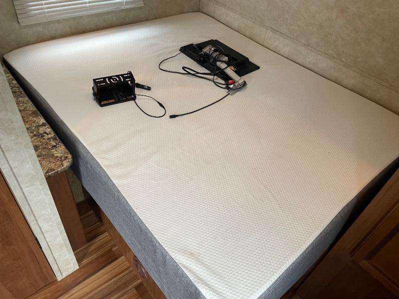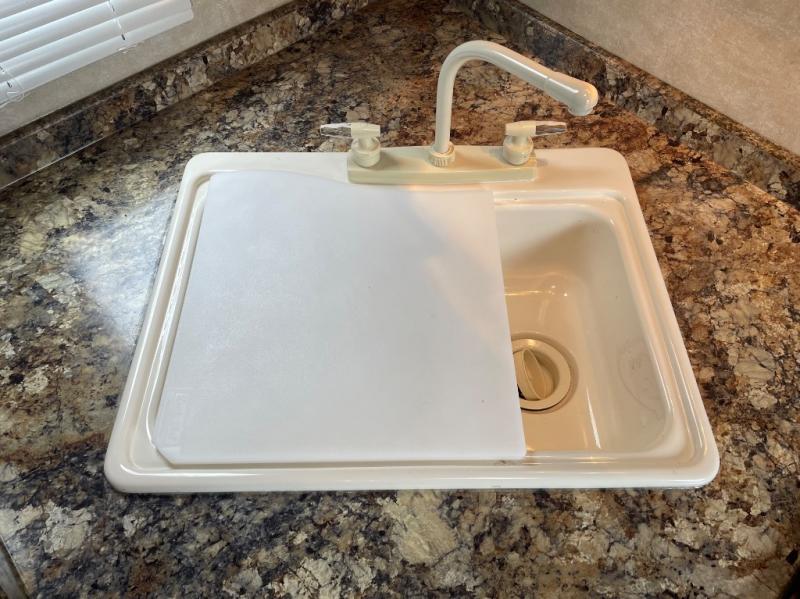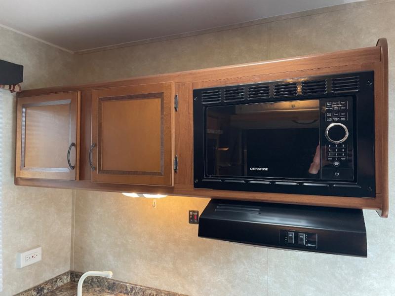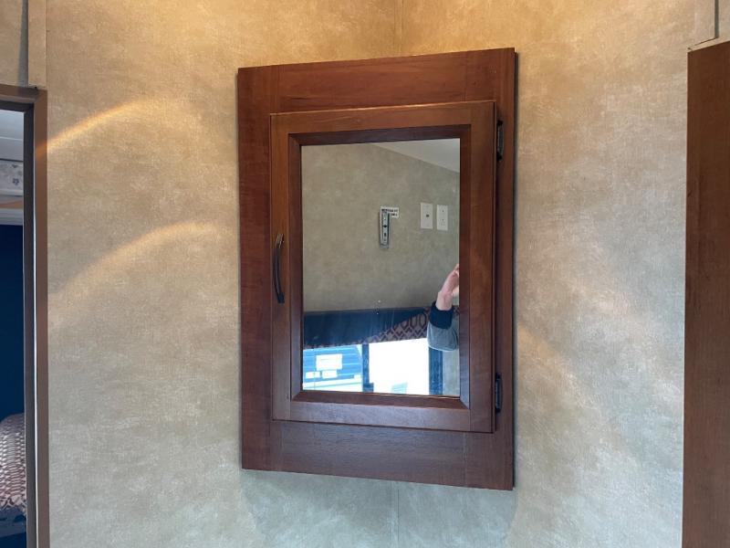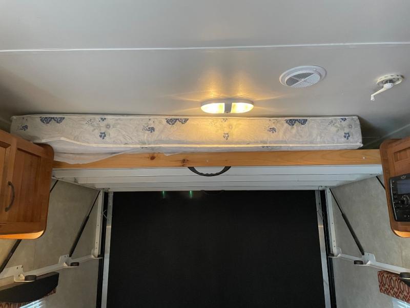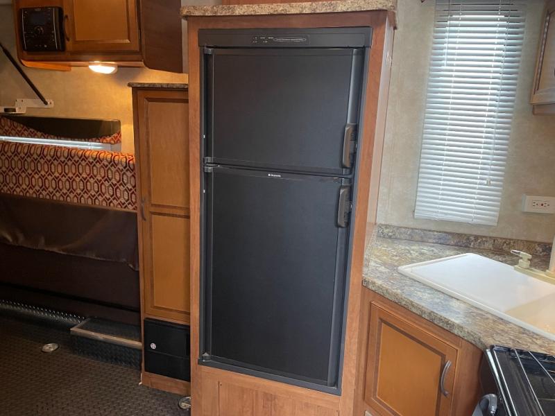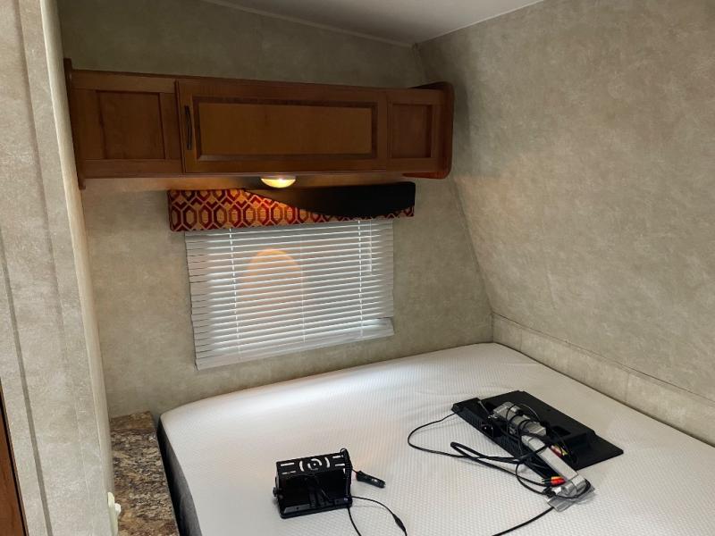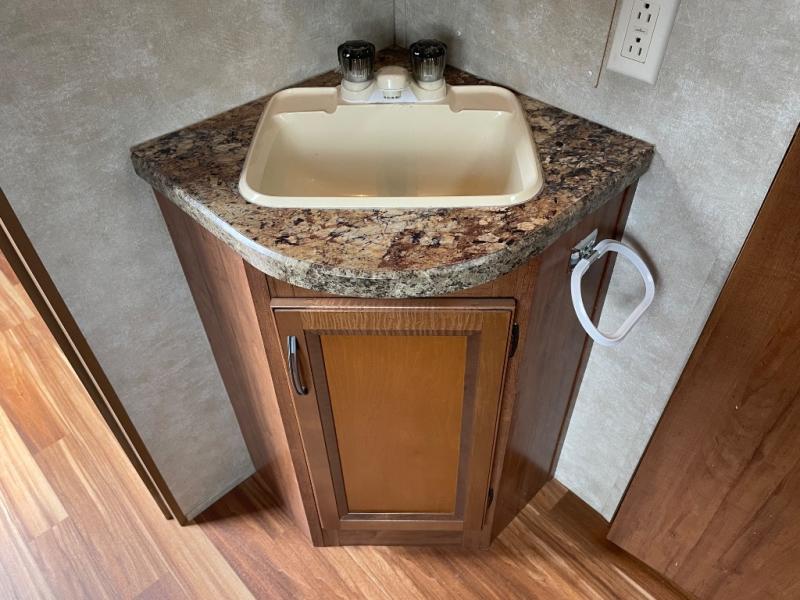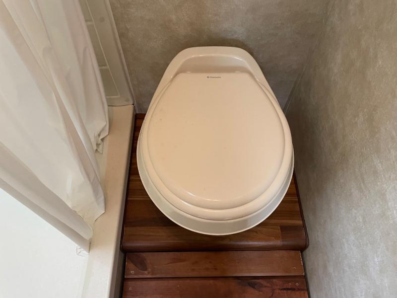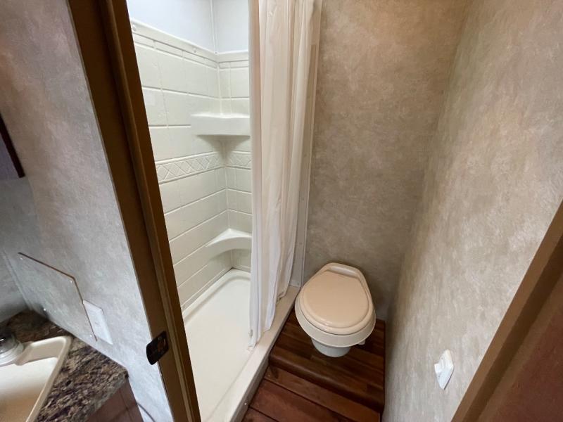 Continue toward the front and find a private bedroom and bath area with a front queen bed, storage wardrobe, and overhead cabinet. There is also a private tub/shower and toilet area with sink just outside the bathroom door, plus so much more!
