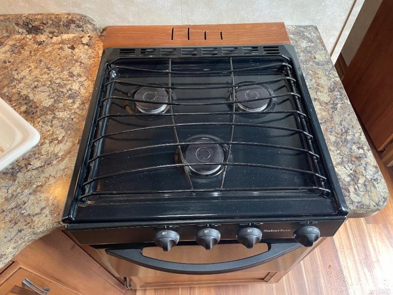 Use the rear ramp door to load and unload easily and secure your toys for travel. Straight in across from the side man door find kitchen amenities featuring a pantry, refrigerator, double sink, and three burner range with microwave overhead.