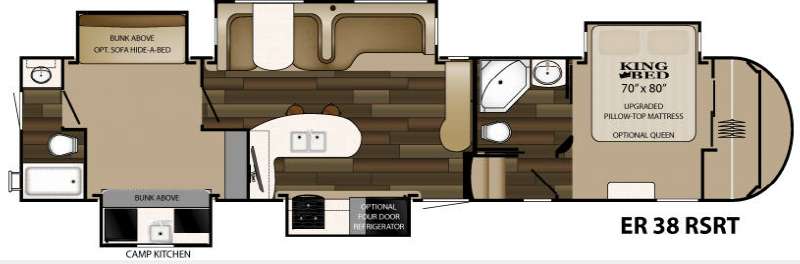 This ElkRidge fifth wheel by Heartland RV has it all! Model 38SRT features FIVE slide outs for added interior space, a bunk house that the kids will love, TWO FULL baths, outdoor camp kitchen, dual slides, and a king size bed!
