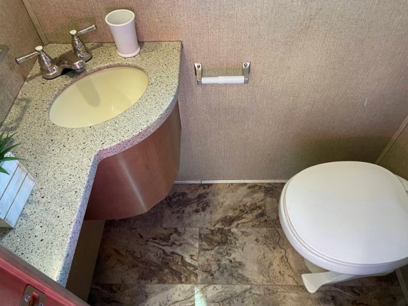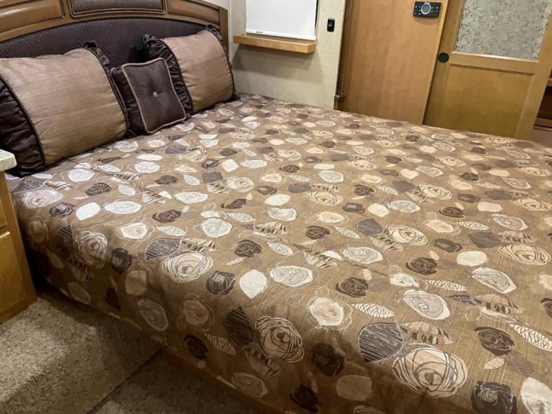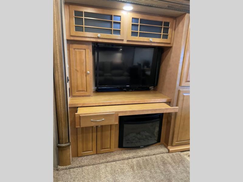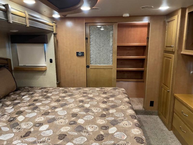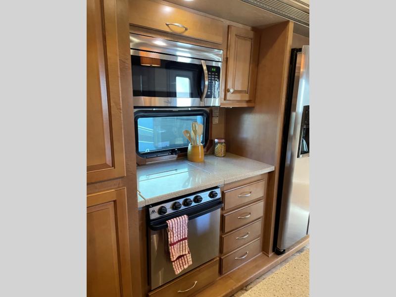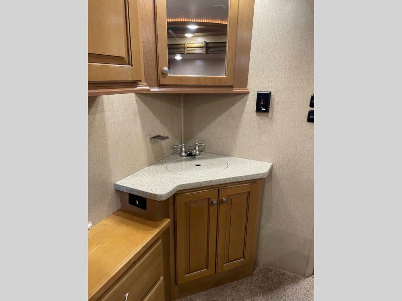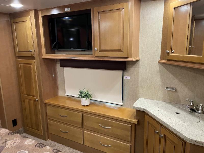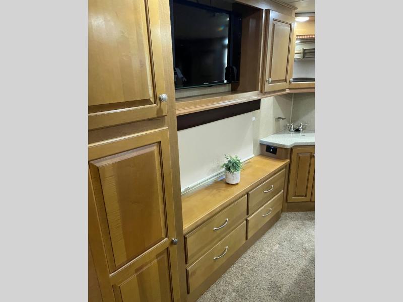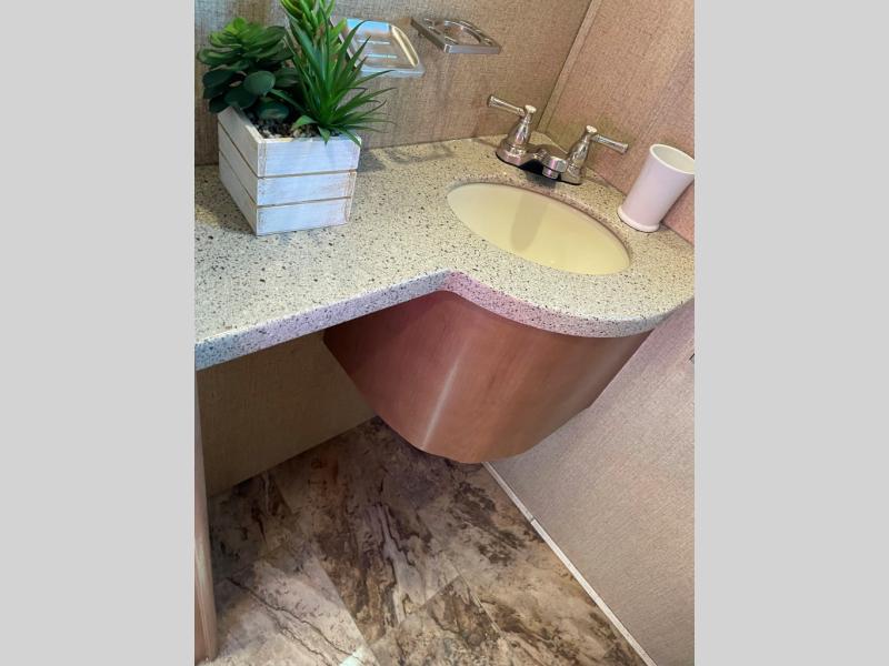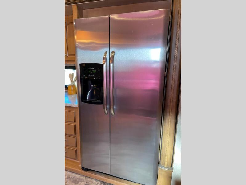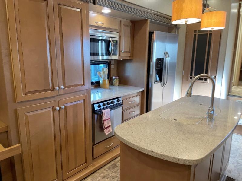 The opposite living/kitchen area slide features a flat screen television, kitchen pantry for your dry goods, a three burner range, and double door refrigerator. There is also a kitchen island with a double sink for easy clean-up. You will also find an additional storage closet nearby.