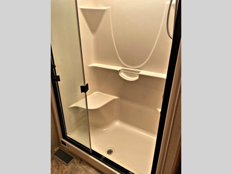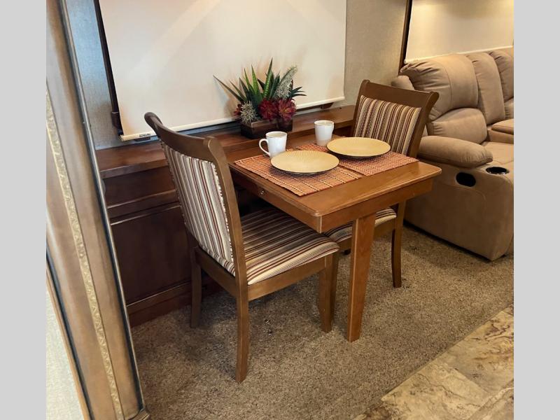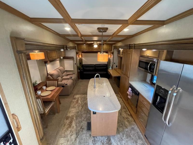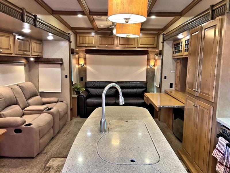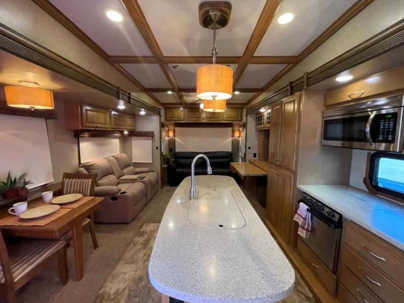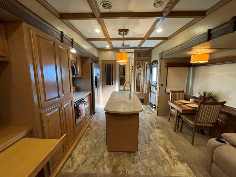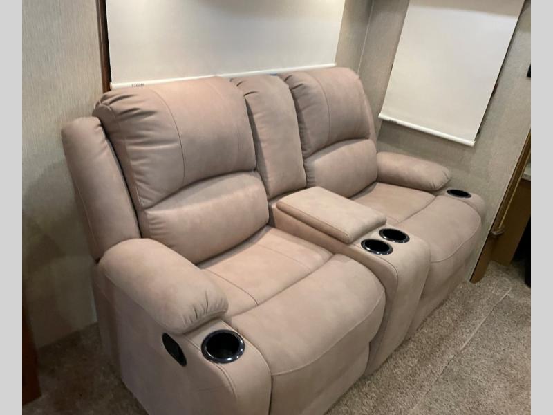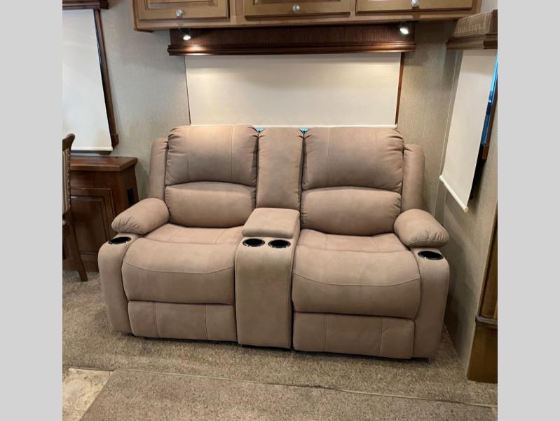 The Savannah Landmark fifth wheel will have you saying, "WOW!" with one peak inside. This triple slide unit is all about making you feel at home. As you step into the unit you are greeted with an open living and kitchen area with double slides opposite one another. One slide features two swivel rocker recliners with an end table between, and a round dinette. There is a rear sofa with side tables and an overhead storage cabinet for your convenience also.