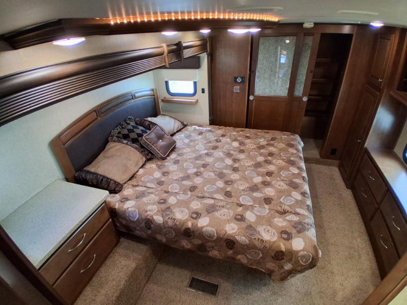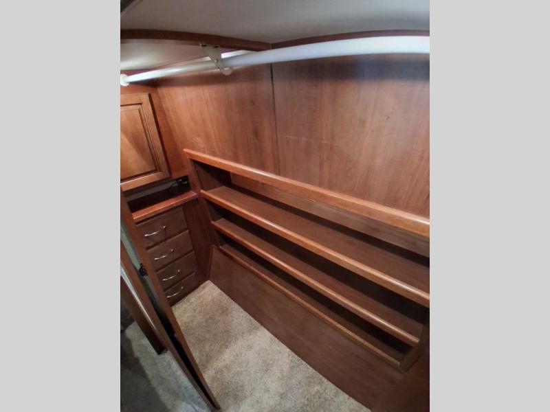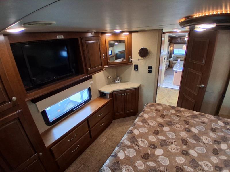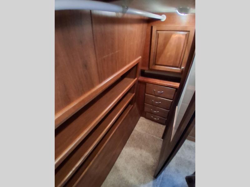Lastly, step into a large spacious bedroom with king bed slide including more storage. There is a large front wardrobe with sliding doors, plus more drawer storage opposite the bed. There is also a corner sink, and so much more!
