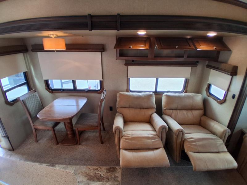 The Savannah Landmark fifth wheel will have you saying, "WOW!" with one peak inside. This triple slide unit is all about making you feel at home. As you step into the unit you are greeted with an open living and kitchen area with double slides opposite one another. One slide features two swivel rocker recliners with an end table between, and a round dinette. There is a rear sofa with side tables and an overhead storage cabinet for your convenience also.