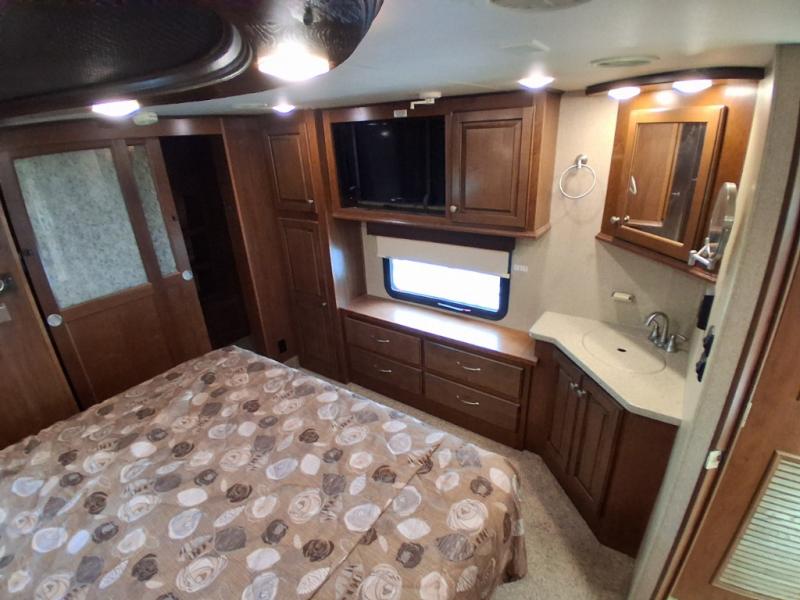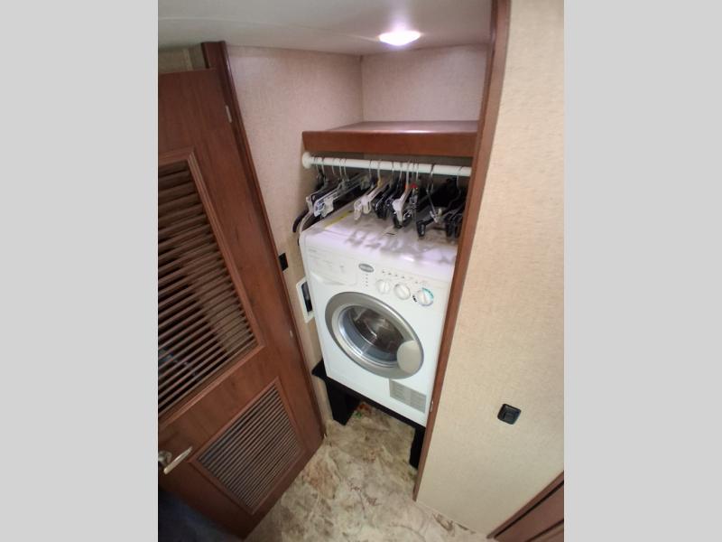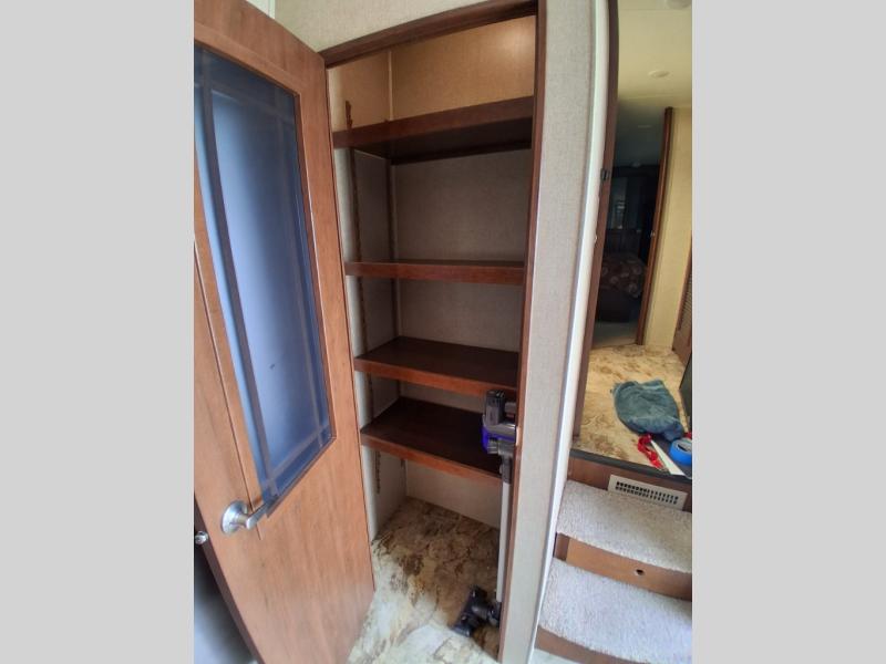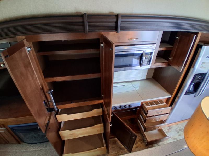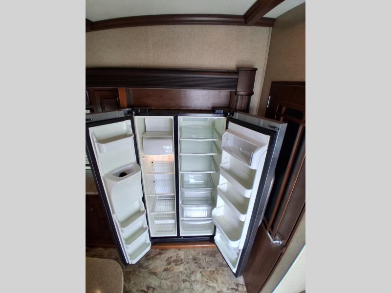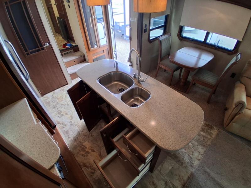 The opposite living/kitchen area slide features a flat screen television, kitchen pantry for your dry goods, a three burner range, and double door refrigerator. There is also a kitchen island with a double sink for easy clean-up. You will also find an additional storage closet nearby.