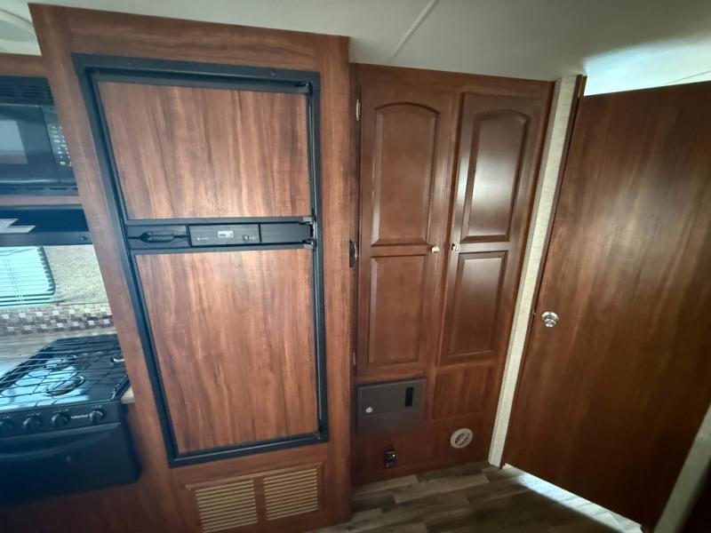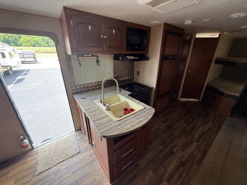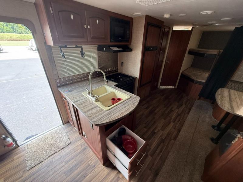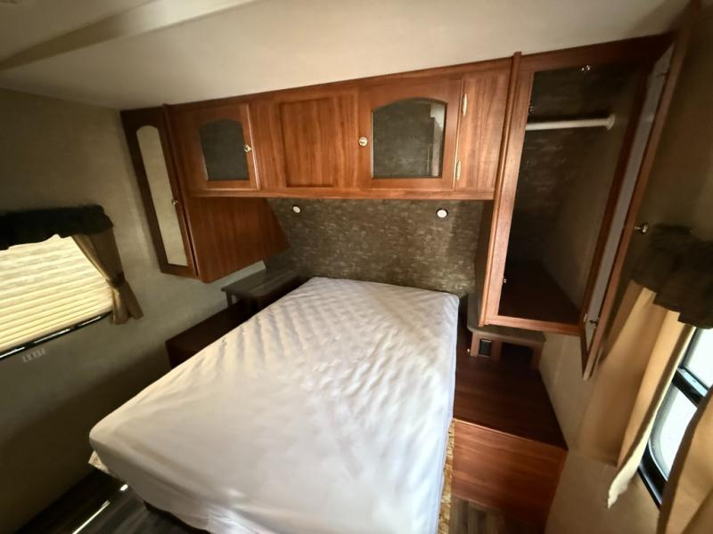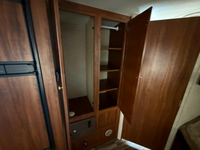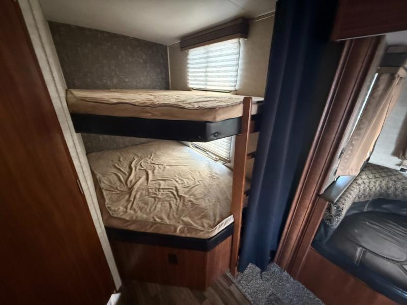 There is a set of queen bed bunks in the opposite rear corner with a ladder for easy access to the top bunk and a curtain that can be pulled for more privacy, plus so much more!
