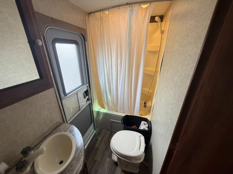 In the rear of this North Trail model find a complete bath with tub/shower, toilet, and sink. There is a cabinet above the sink, and a private outdoor entry for added convenience as well.
