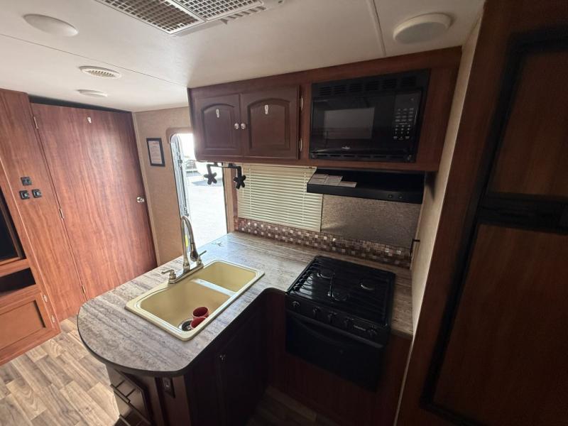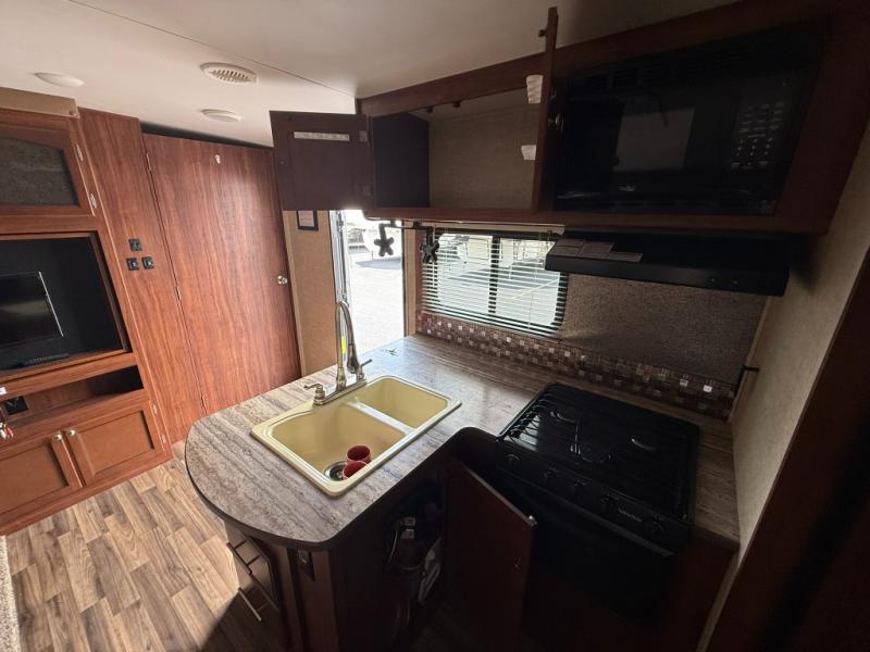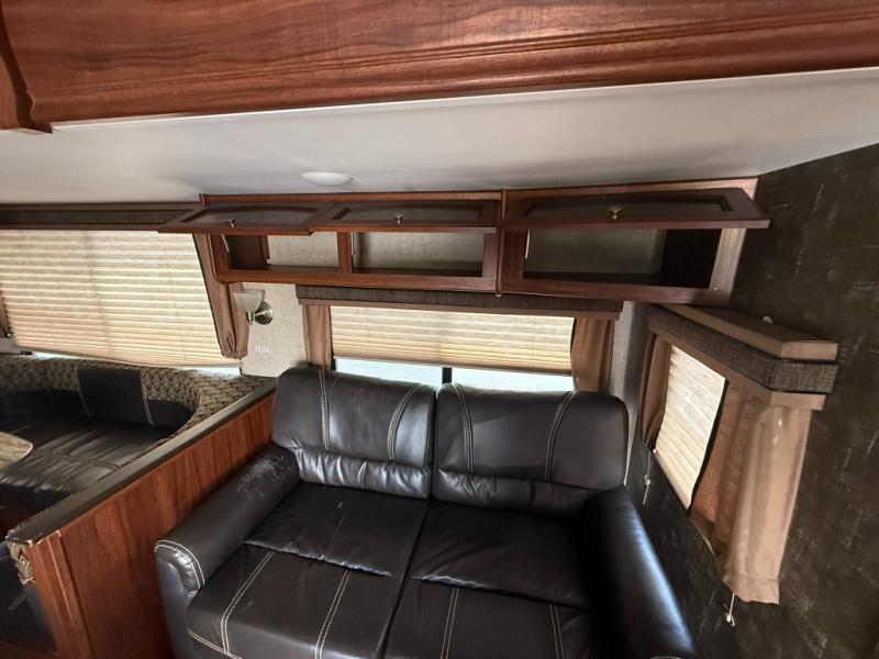 The large slide out sofa and u-shaped dinette offers ample seating for you and your family and friends to enjoy. Both can accommodate overnight guests if needed as well. The sofa even provides some overhead cabinets to help keep you neat and organized.