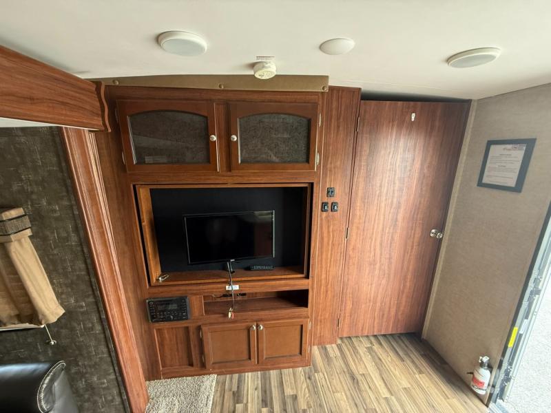 Step inside and notice the front bedroom on your right featuring a queen bed with dual nightstands and shirt closets, plus overhead storage for your things. The entertainment center that is straight ahead through the door features a swivel TV for living area and bedroom viewing so you can easily watch television in bed!