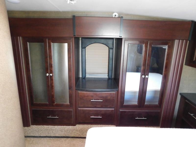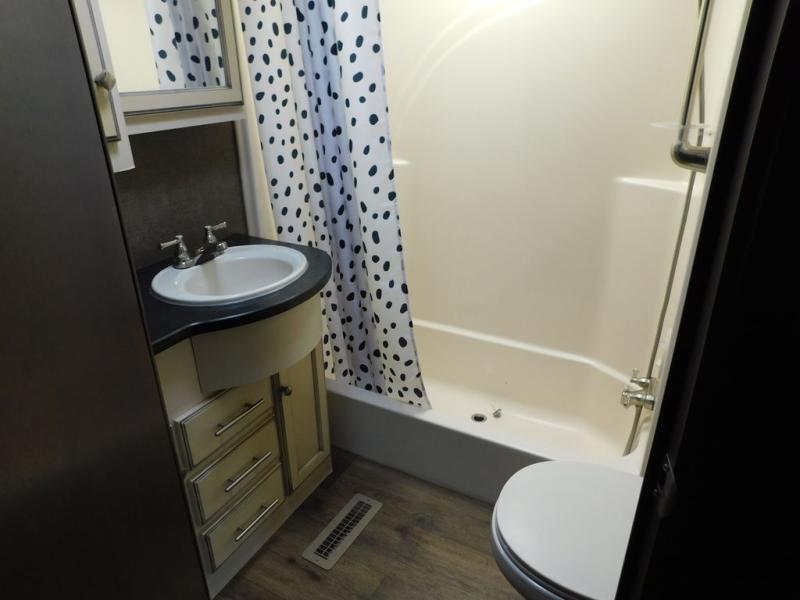 Step up to the front bedroom and side aisle bath. The bath features a toilet, sink and tub/shower. The private bedroom features a queen bed with storage on both sides, there is also a slide out with center dresser flanked by two wardrobes on either side.
