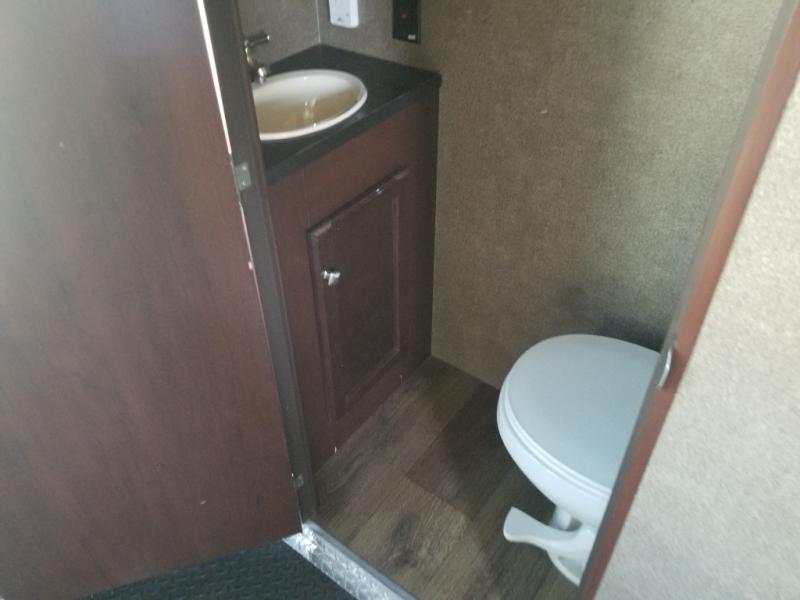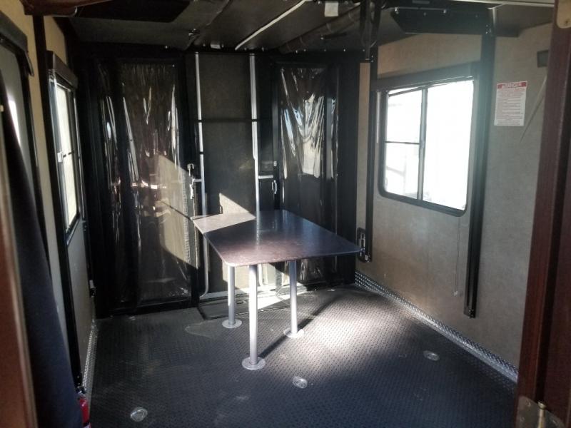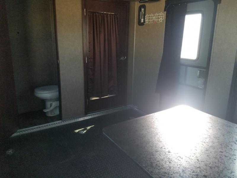 Get started with 12' of garage space including a rear ramp door for ease of loading and unloading. There is also a side man door into the cargo area if you need to check on things while on the move or after the rear ramp door is closed. There is also an additional loft space in the front of the cargo area and a convenience half bath too. A ladder to the loft can be found just inside the main living area door.