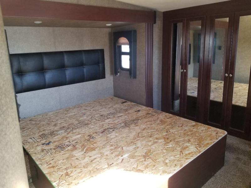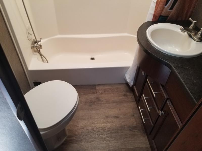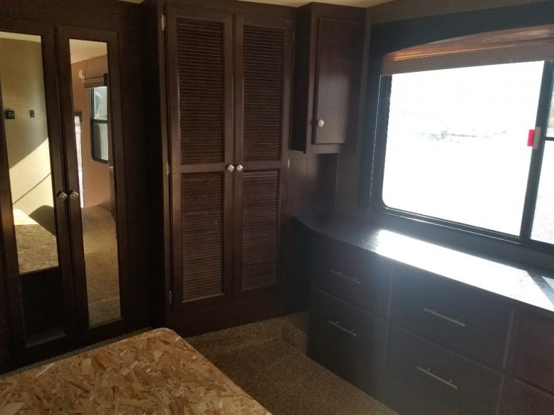 Just inside the main entry door you can step up to a side aisle bath and front bedroom. The bath features a toilet, sink and sunken tub/shower. The private bedroom in front feature a slide out bed, a front wardrobe with sliding doors, and a dresser for even more storage. There is also a closet with washer dryer prep, plus so much more.