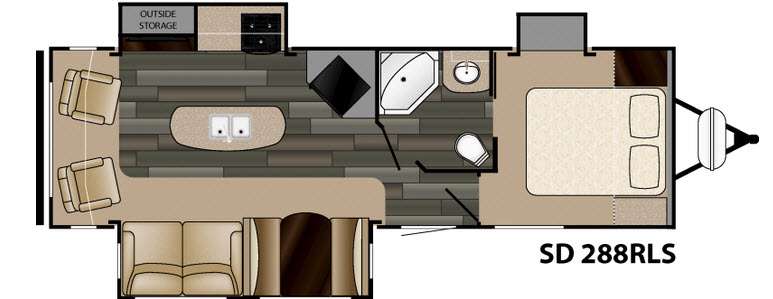 This Sundance travel trailer 288RLS features a rear living layout, triple slides for added interior space, a convenient kitchen island, plus you can add an optional fireplace if you like!