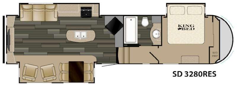 This Keystone Sundance fifth wheel model 3280RES offers a rear entertainment center layout, triple slides for added interior space, and a king bed in front.